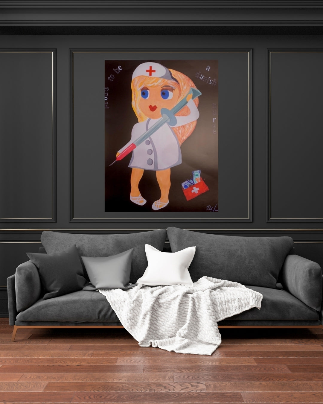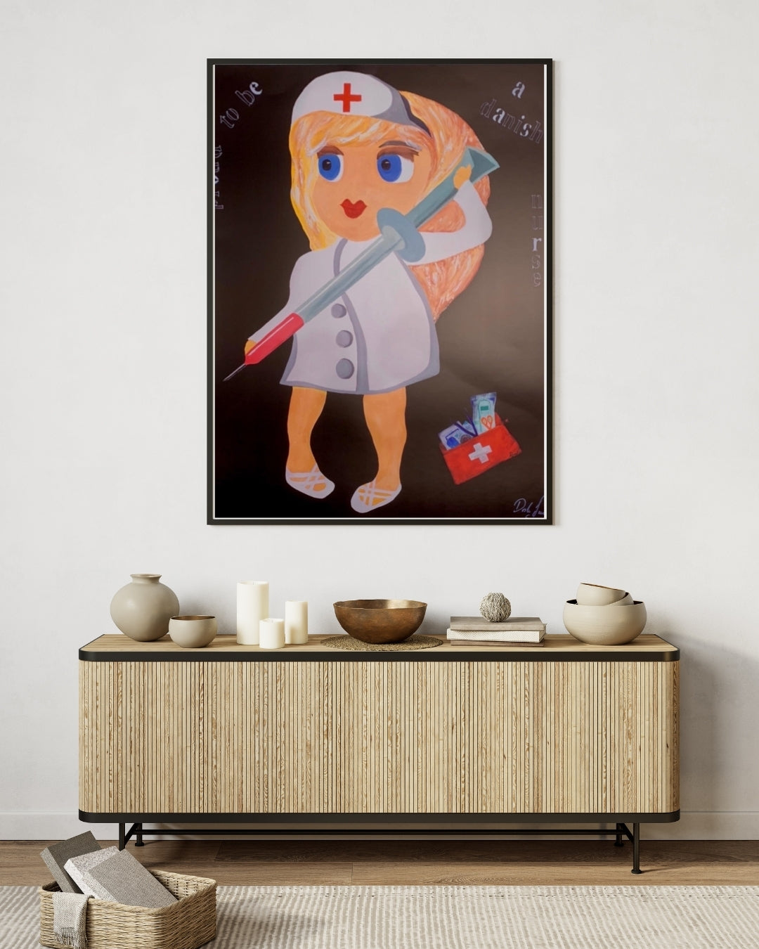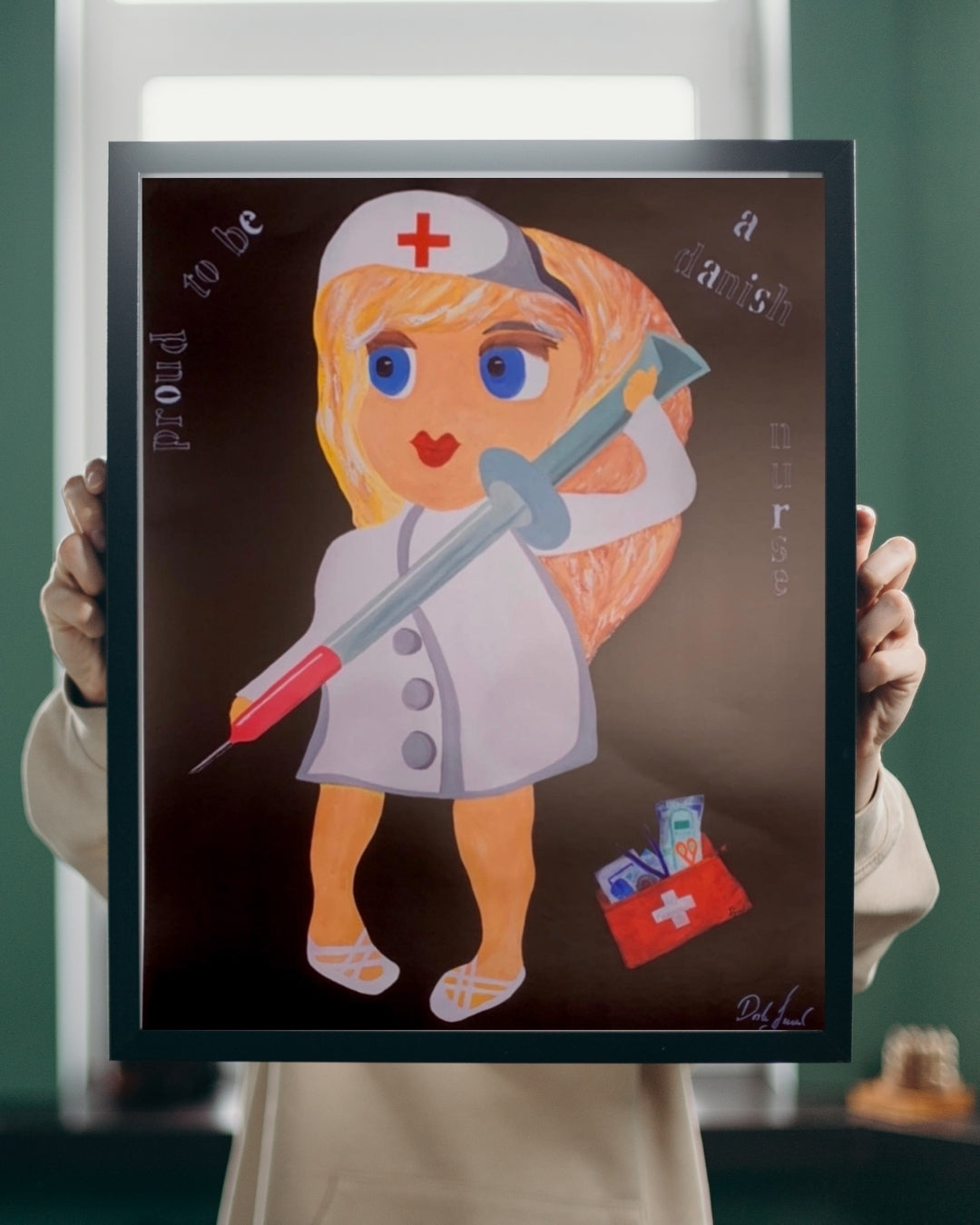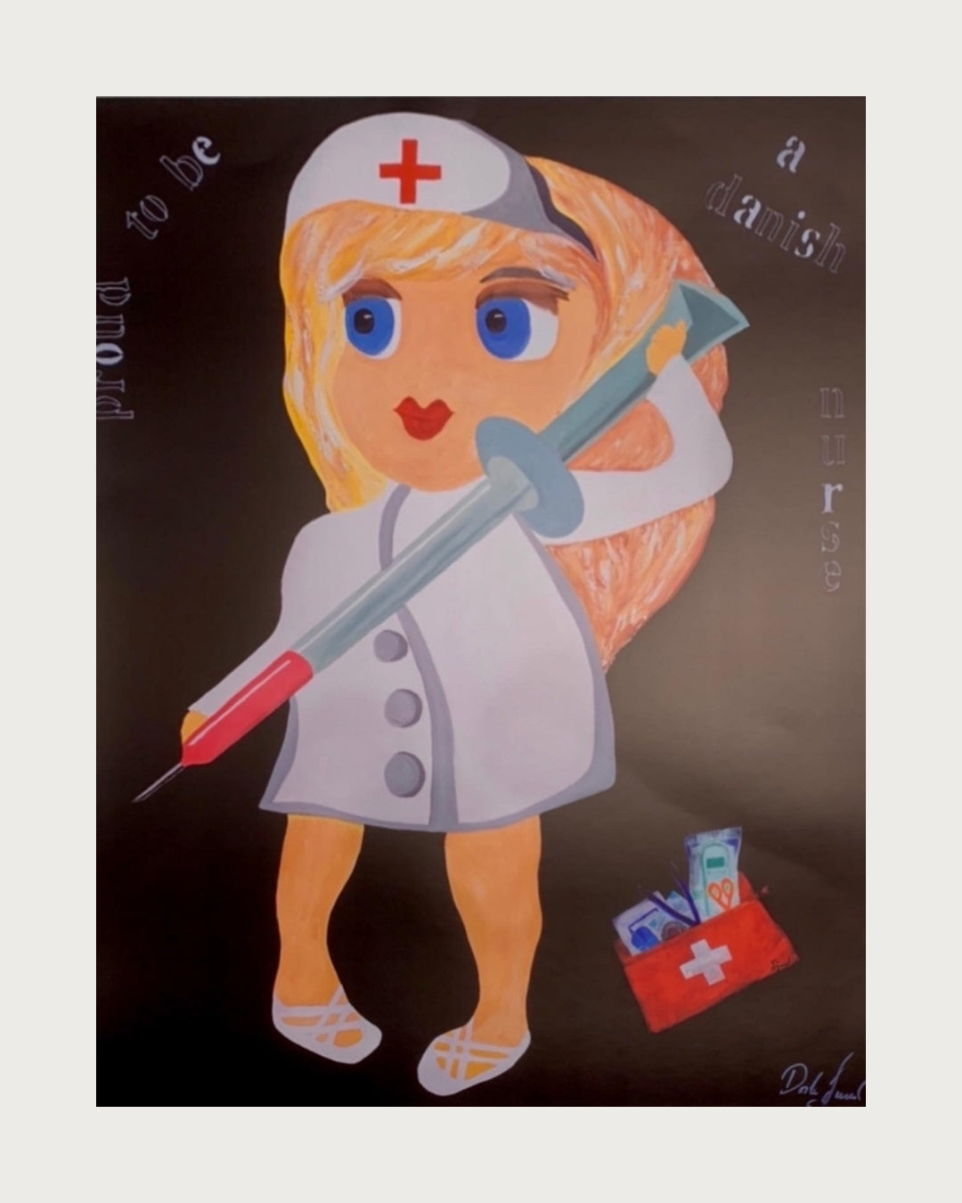 Plakat baseret på originalt maleri, skabt af en sygeplejerske med hjertet fuld af faglig stolthed og kreativitet. Motivet hylder det danske sygeplejefag med et humoristisk og kærligt blik – og med plads til både sprøjter og symboler på omsorg.