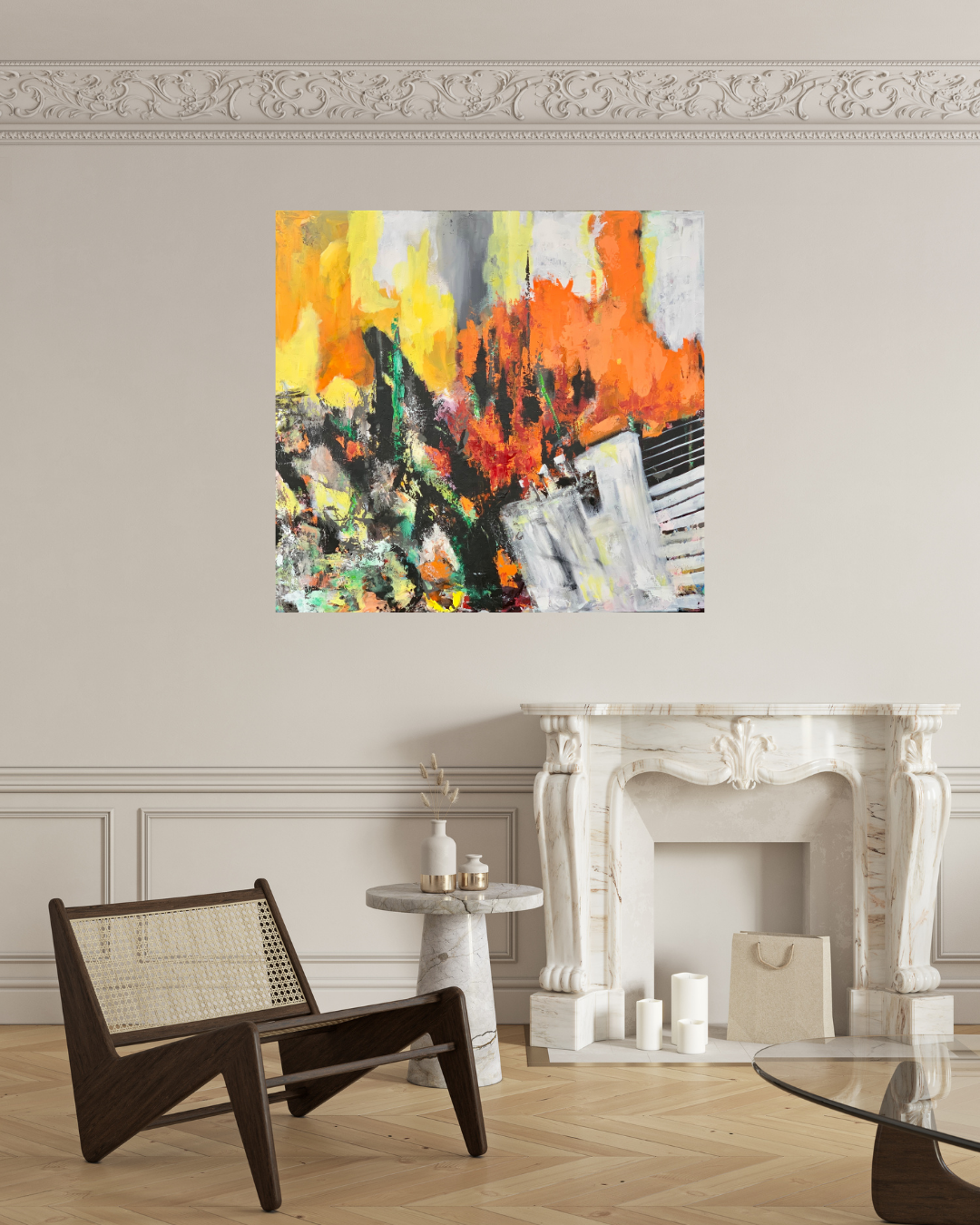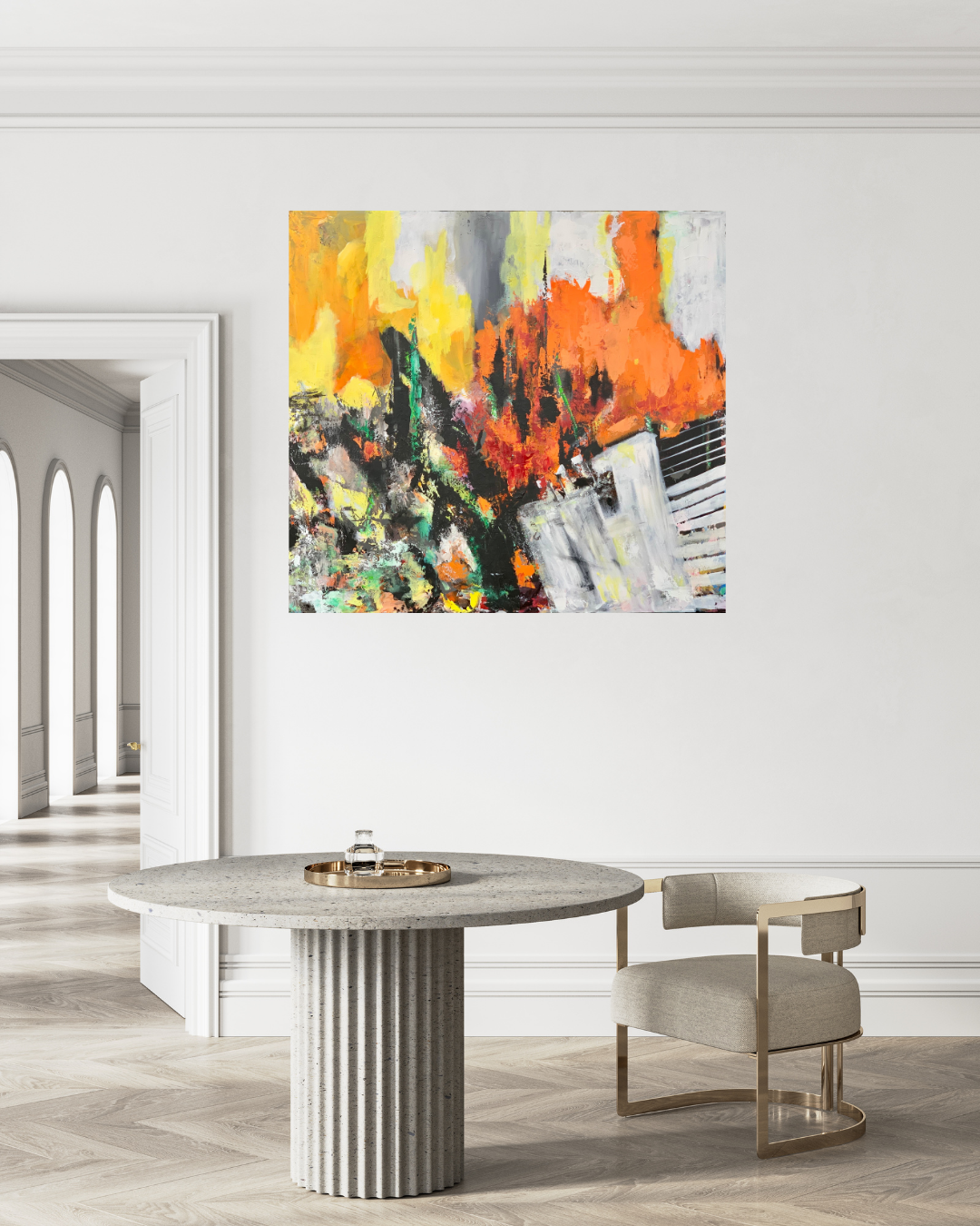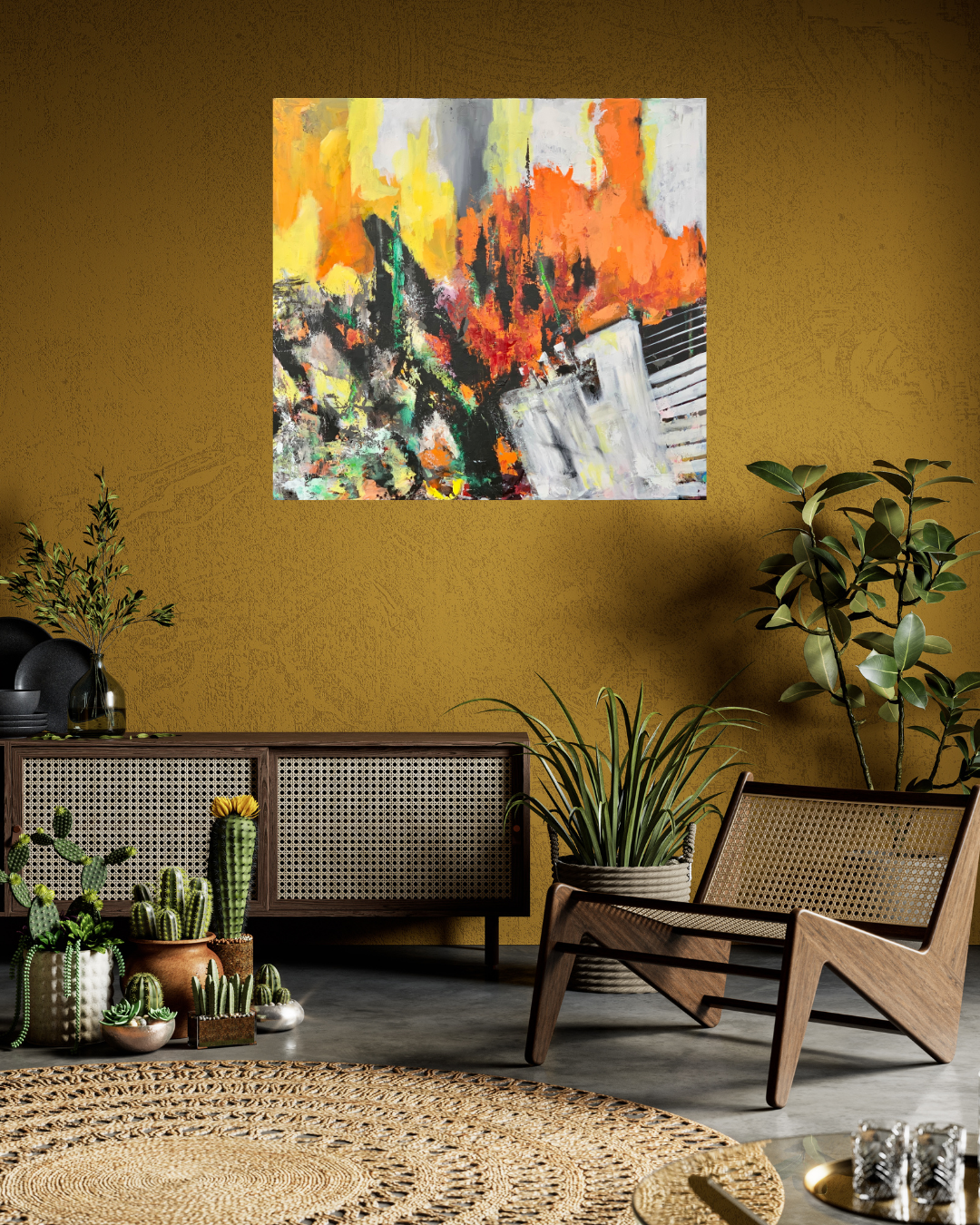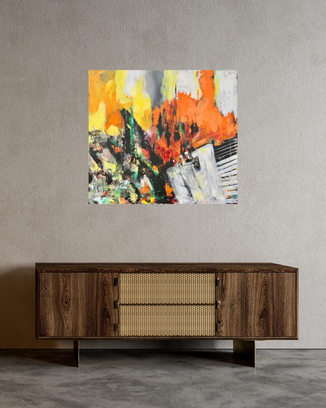 Kraftfuldt akrylmaleri med stærke kontraster og intense farver, der giver associationer til både natur og storby. Det er malet i flere lag med spartel og pensel, hvilket skaber en levende og rå tekstur på overfladen. Kompositionen balancerer kaos og struktur – og inviterer beskueren til egen tolkning.
