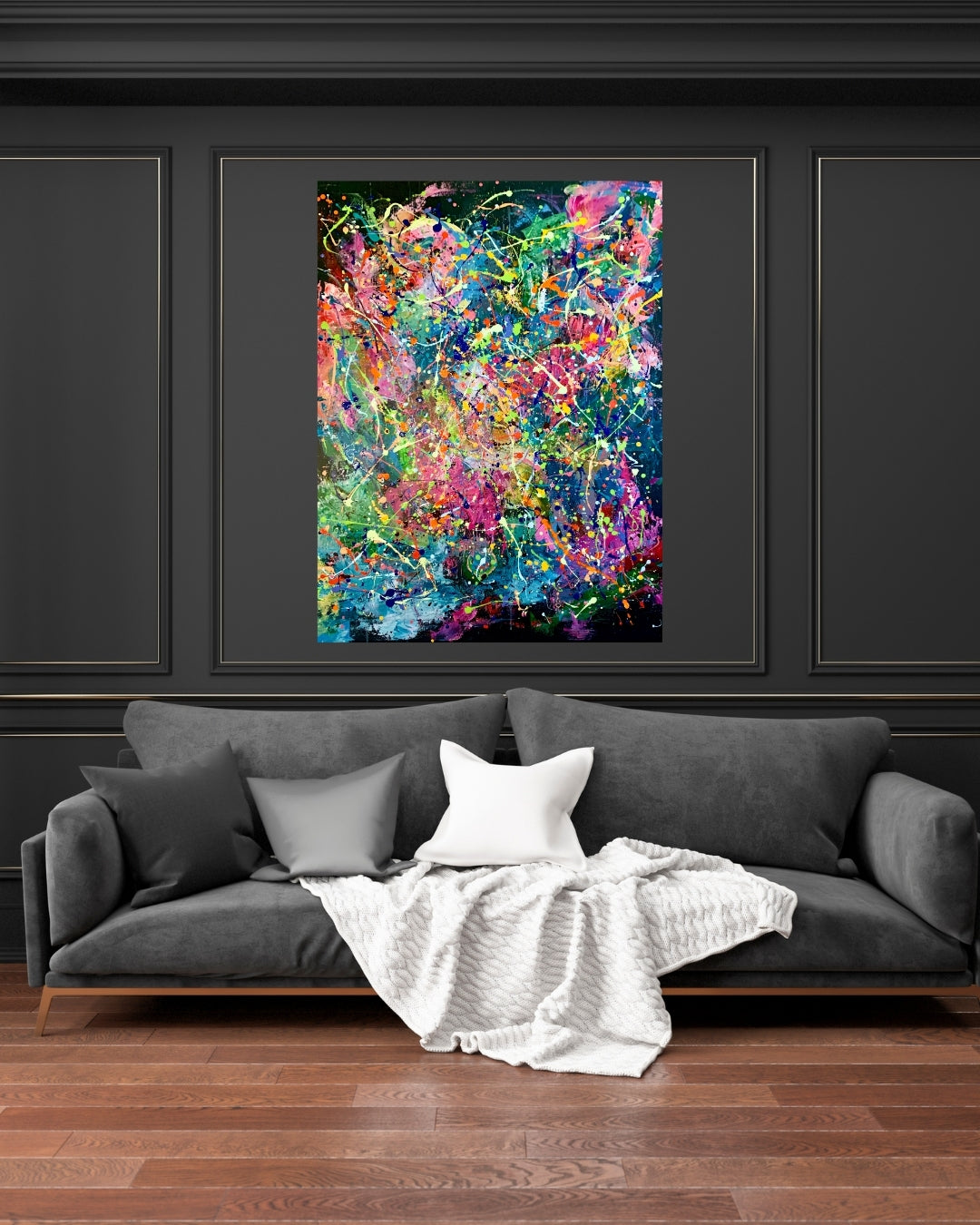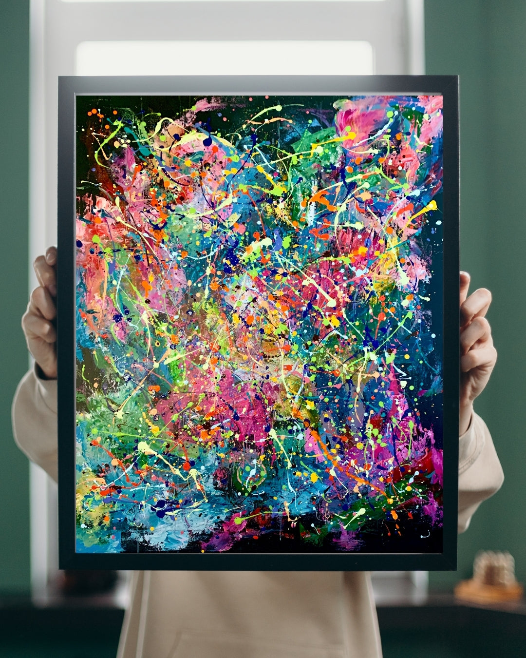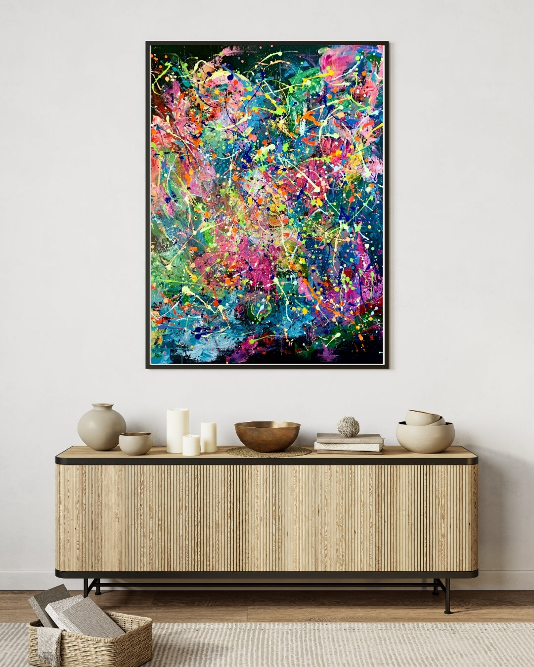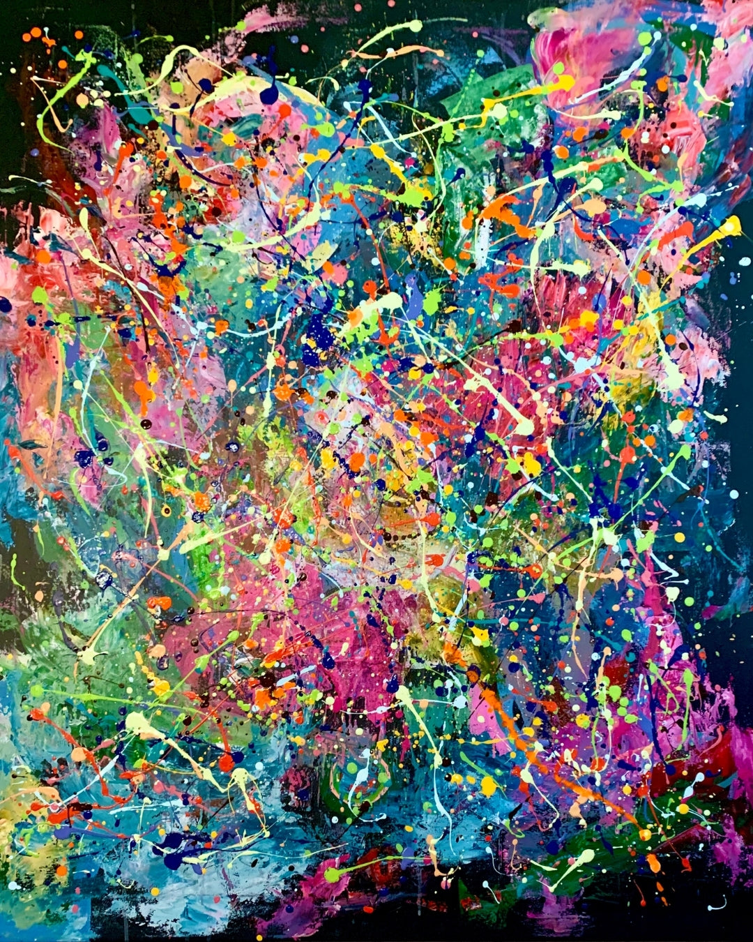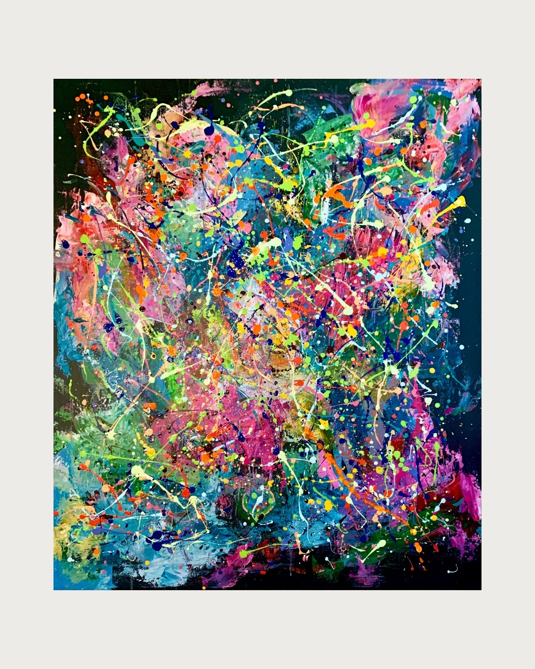 Et eksplosivt og farverigt akrylmaleri skabt med driptech-teknik – en metode, hvor lag på lag bygges op med abstrakte former og dekorative farvesprøjt. I dette værk er der tilføjet papirfragmenter med designerlim, hvilket skaber en spændende struktur og dybde. Farverne er nøje udvalgt og harmonerer i et levende og energisk samspil.