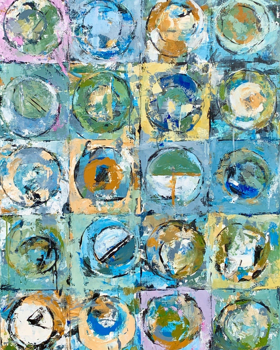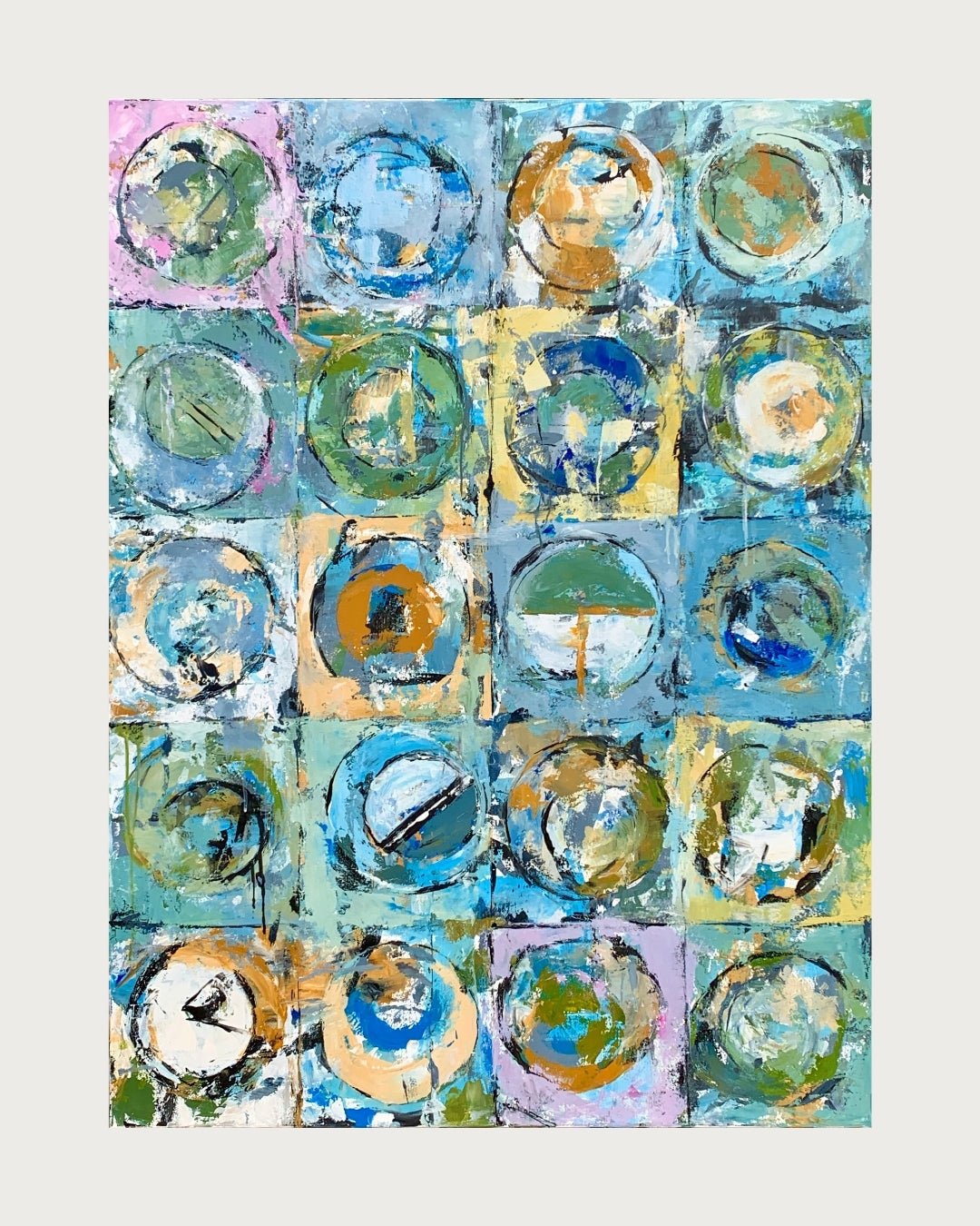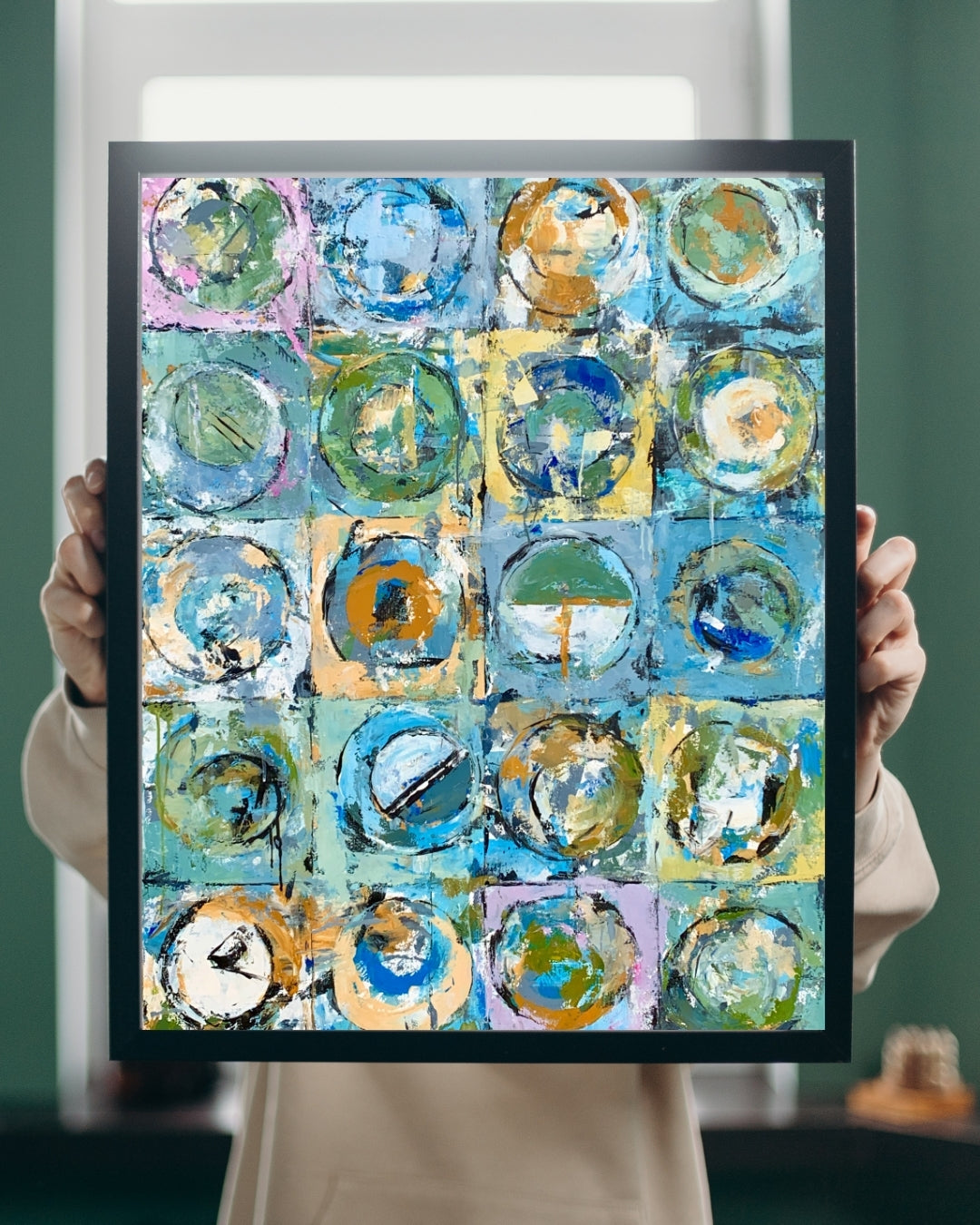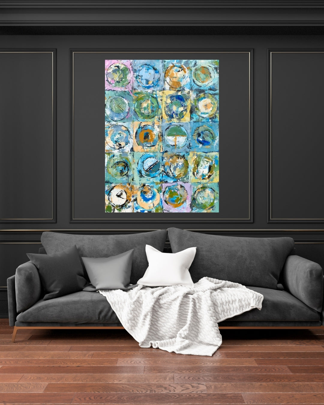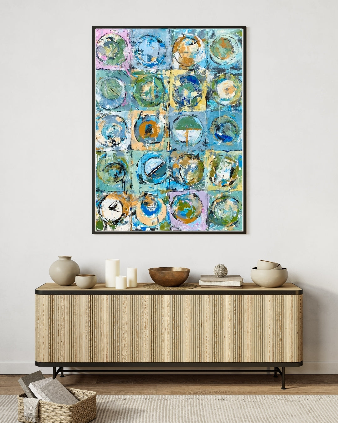 Værket er skabt med både spartel og hænder, hvilket giver en unik tekstur og dybde. Det er holdt i fem farver, som er blandet for at skabe harmoniske og afbalancerede nuancer.