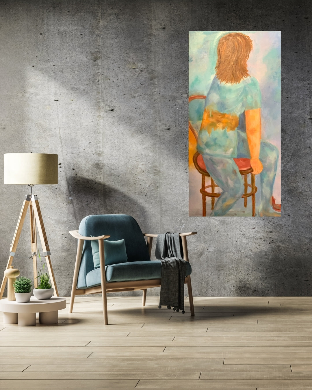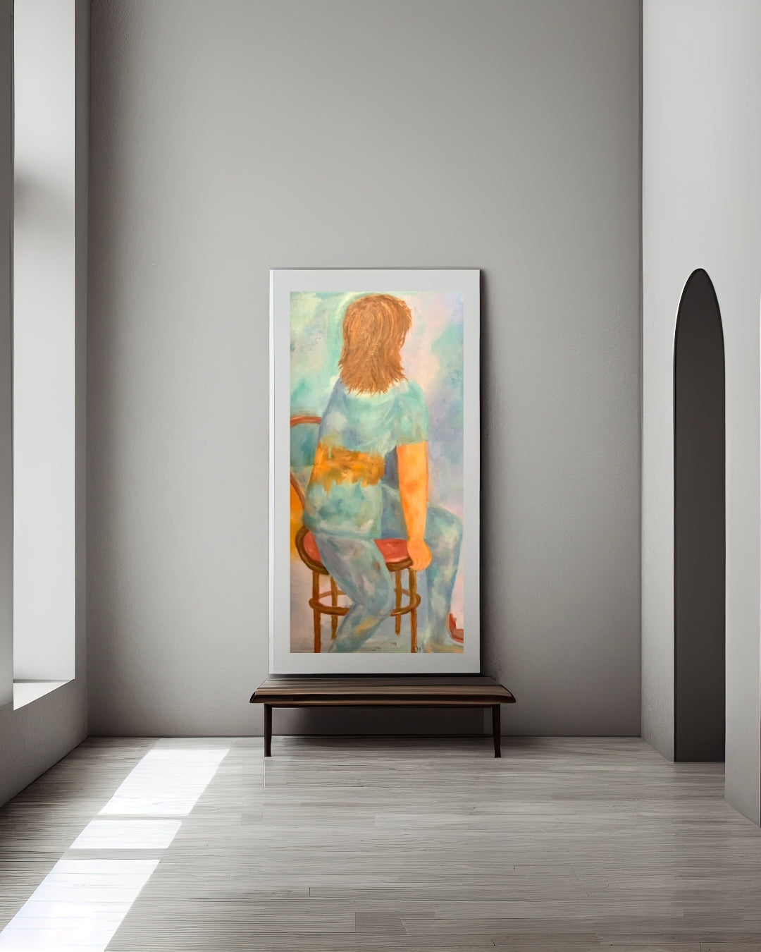 Et farverigt og udtryksfuldt værk malet med olie. Figuren og stolen skaber et stille øjeblik midt i farverig bevægelse – med både personlighed og ro.