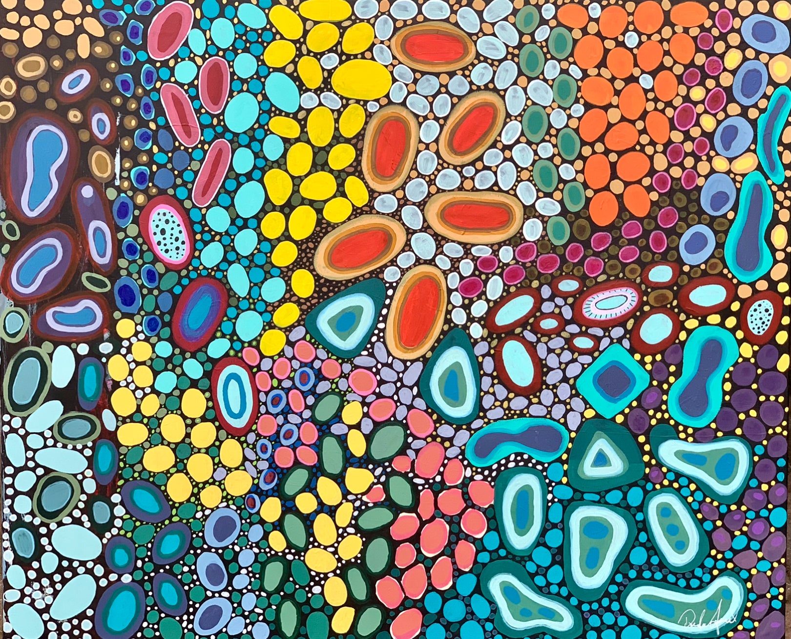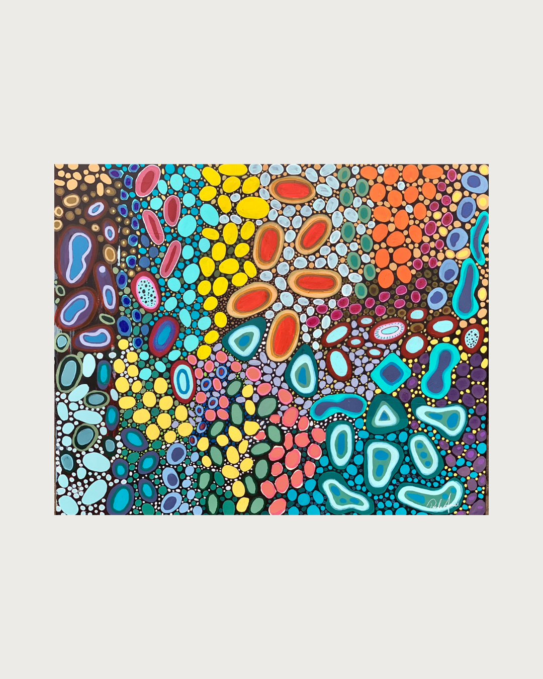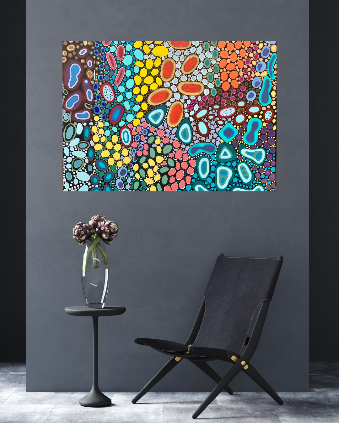 Et legende og abstrakt værk malet med akryl, hvor former og bevægelse skaber sin egen rytme. Farverne er sat i spil for at give ro og balance – men også energi. Et billede der indbyder til fortolkning og fordybelse.