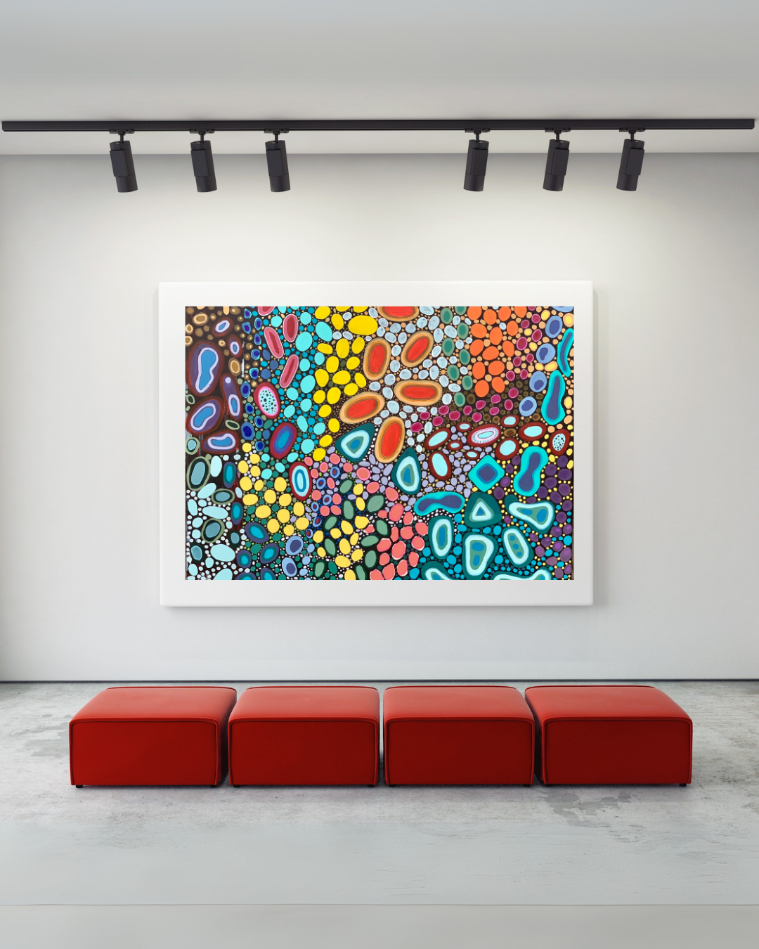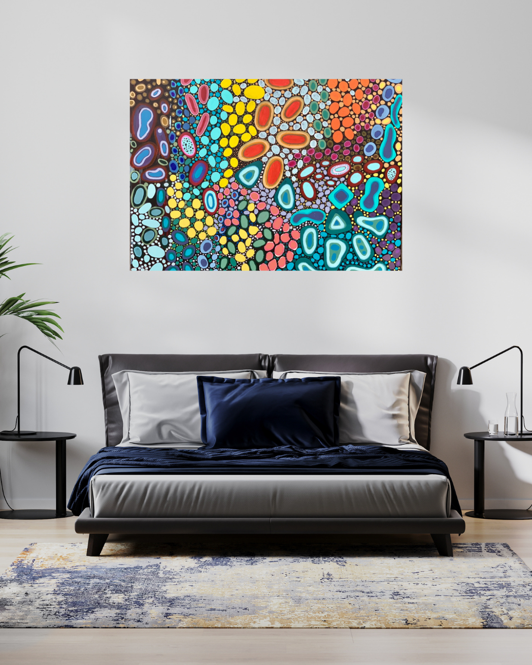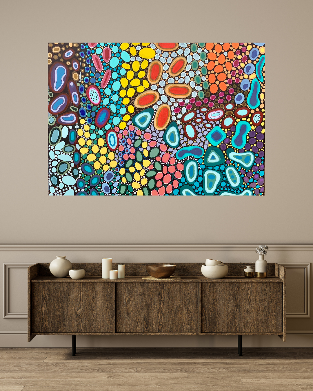 Et legende og abstrakt værk malet med akryl, hvor former og bevægelse skaber sin egen rytme. Farverne er sat i spil for at give ro og balance – men også energi. Et billede der indbyder til fortolkning og fordybelse.
