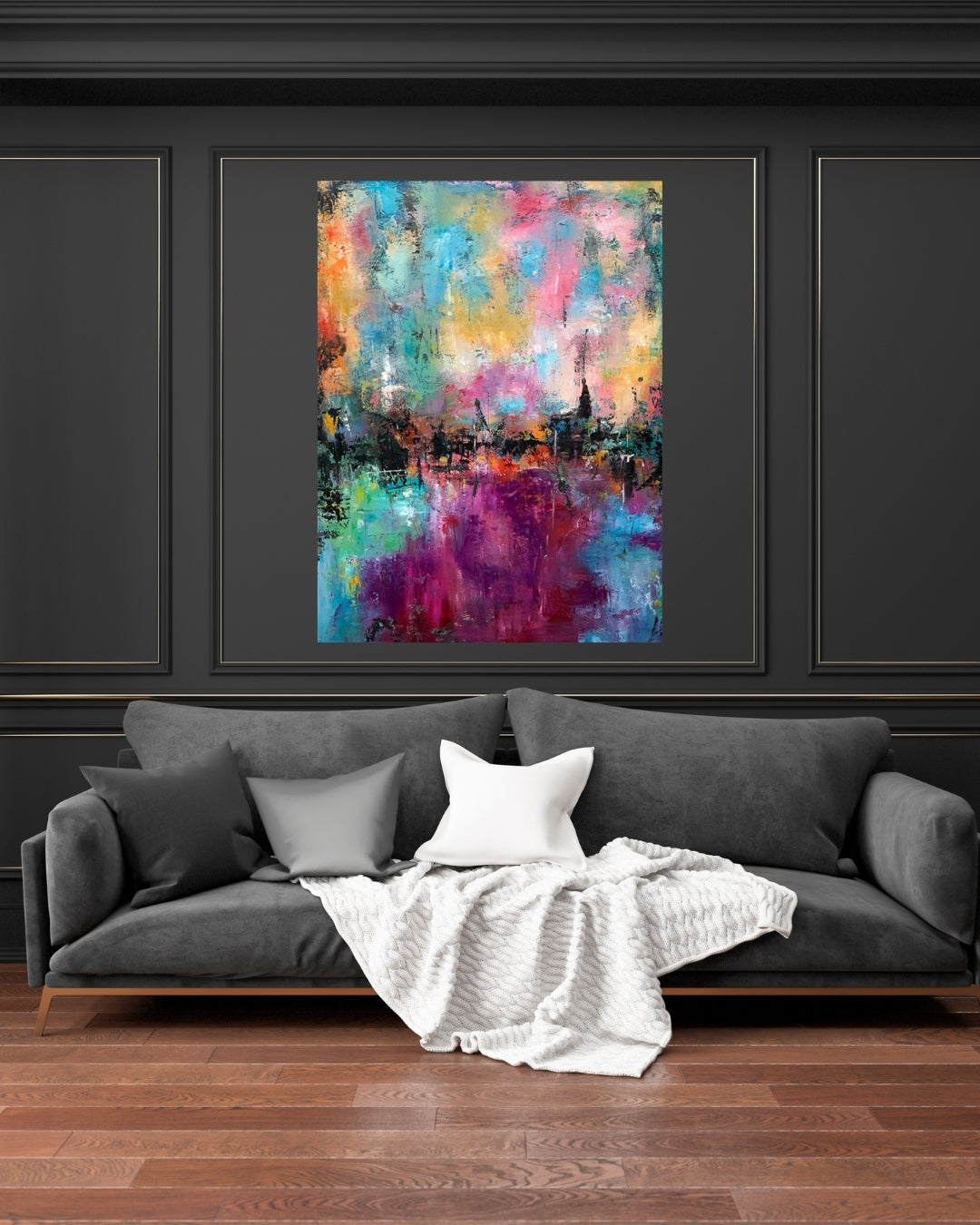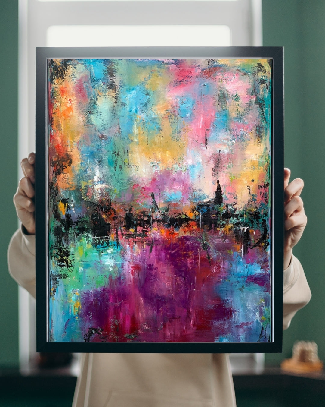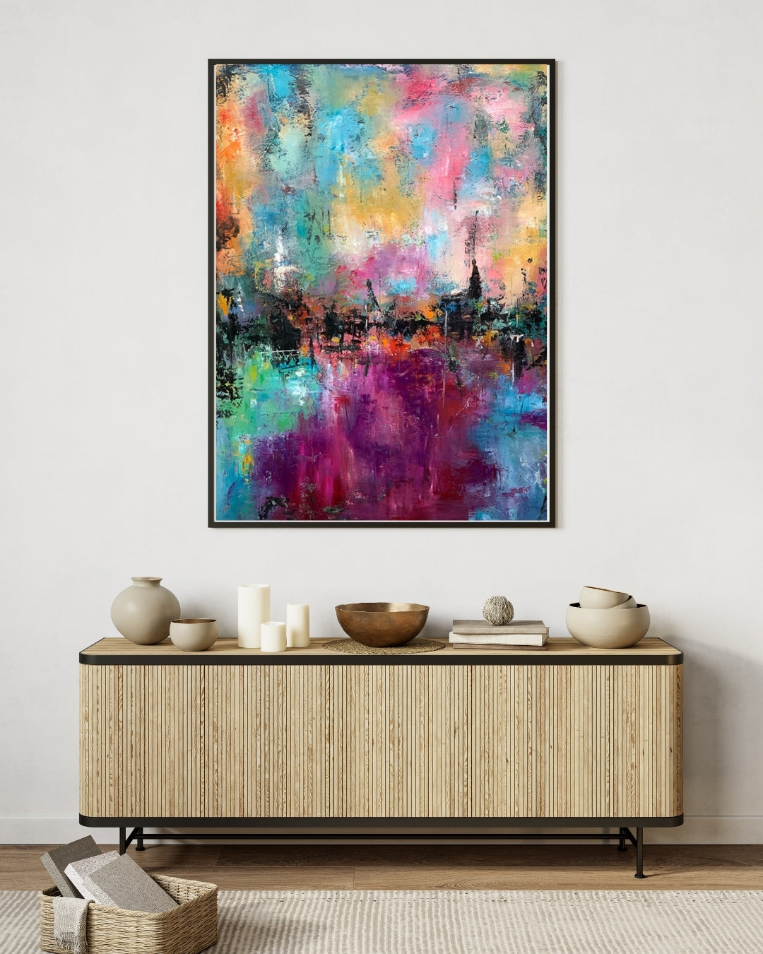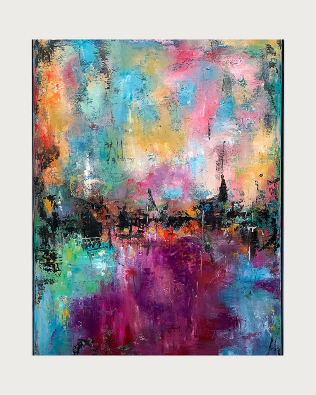 Der er noget dragende og let over dette værk – som om farverne svæver frit og fortæller deres egen historie. "Magical" er malet i flere lag med olie og oliepastel, og farverne er valgt med hjertet. Et varmt og harmonisk udtryk, der løfter rummet og giver ro til øjet. Værket er signeret, indrammet i hvid og klar til at komme op at hænge.