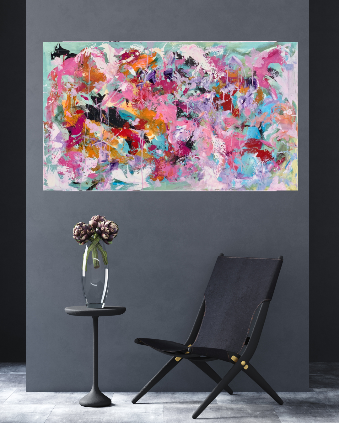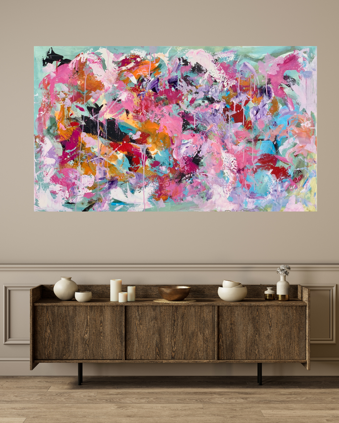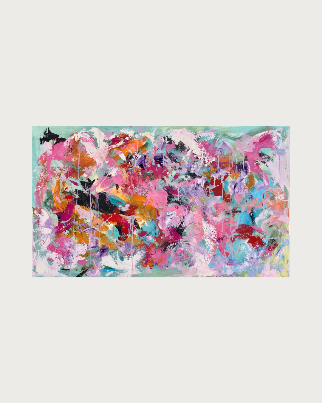 Et abstrakt akrylmaleri med liv og energi. Farverne arbejder i lag og kontraster, og skaber et udtryk, der både er dynamisk og afbalanceret. Et værk der inviterer til egen fortolkning og passer smukt ind i mange typer rum.
