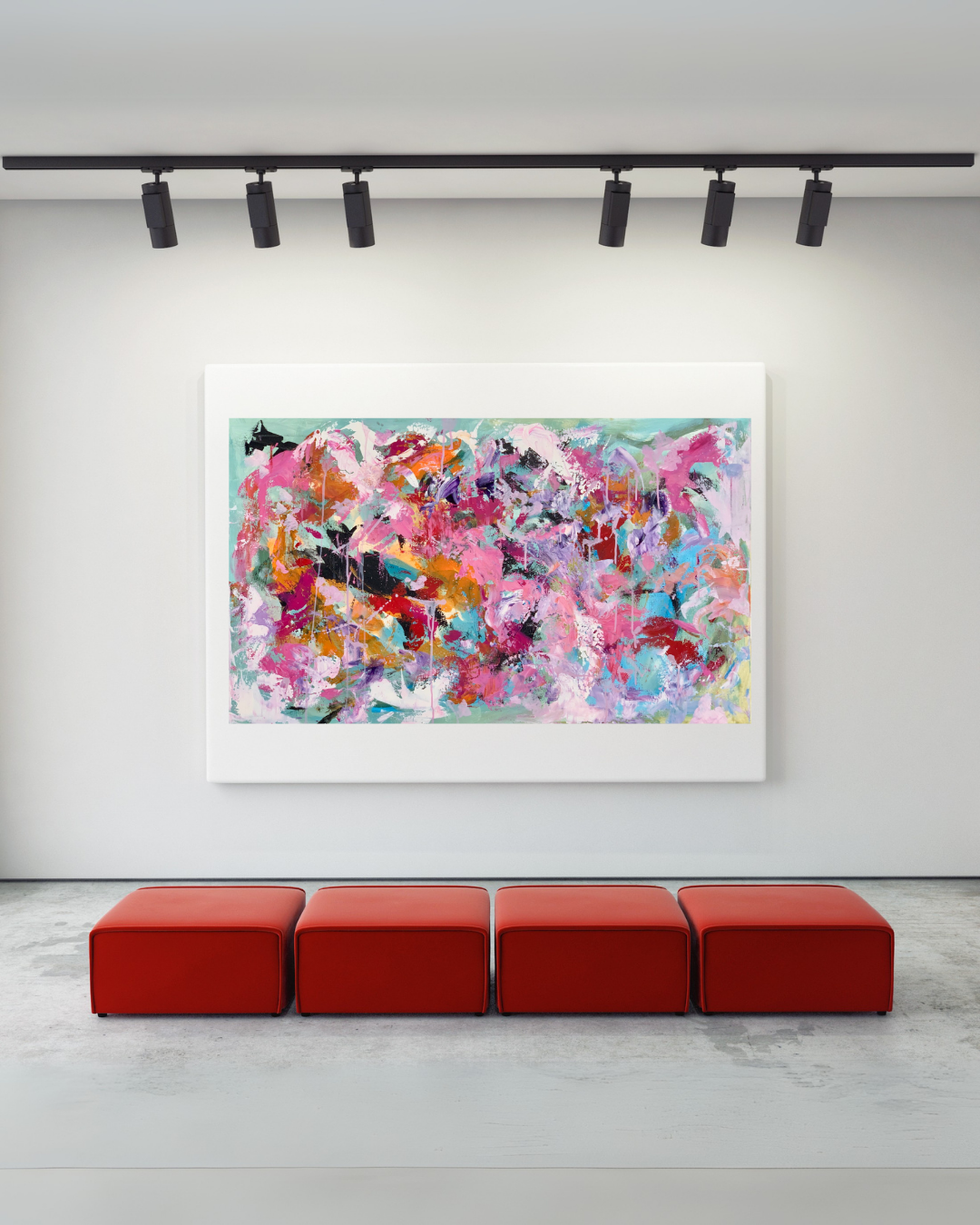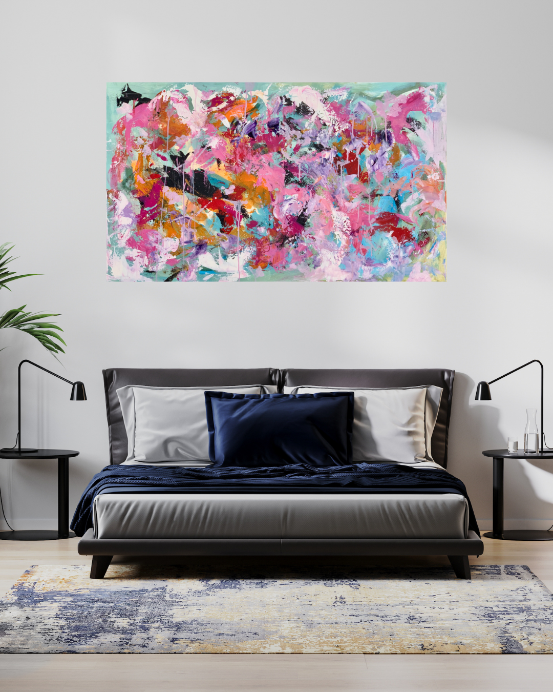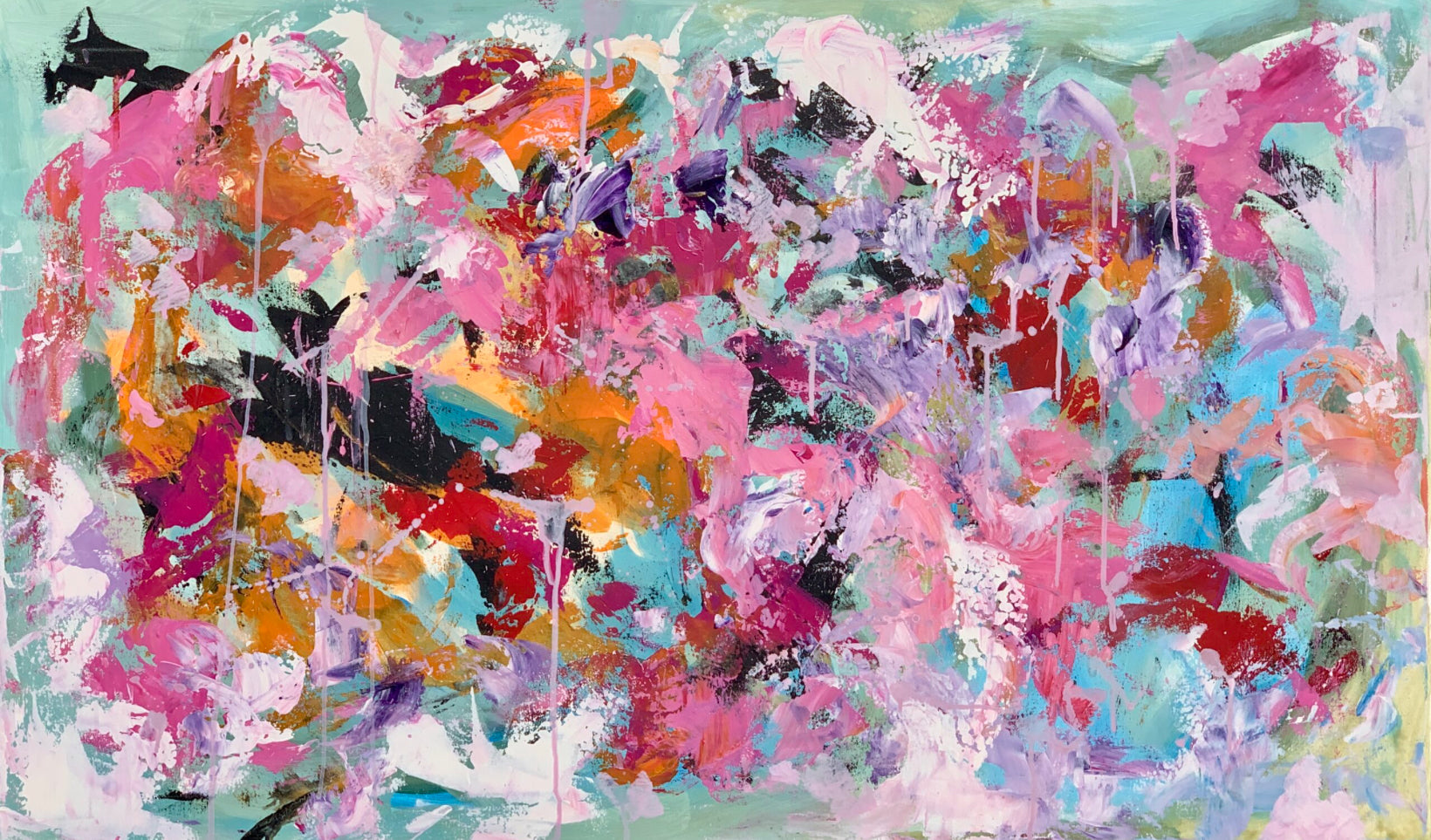 Et abstrakt akrylmaleri med liv og energi. Farverne arbejder i lag og kontraster, og skaber et udtryk, der både er dynamisk og afbalanceret. Et værk der inviterer til egen fortolkning og passer smukt ind i mange typer rum.