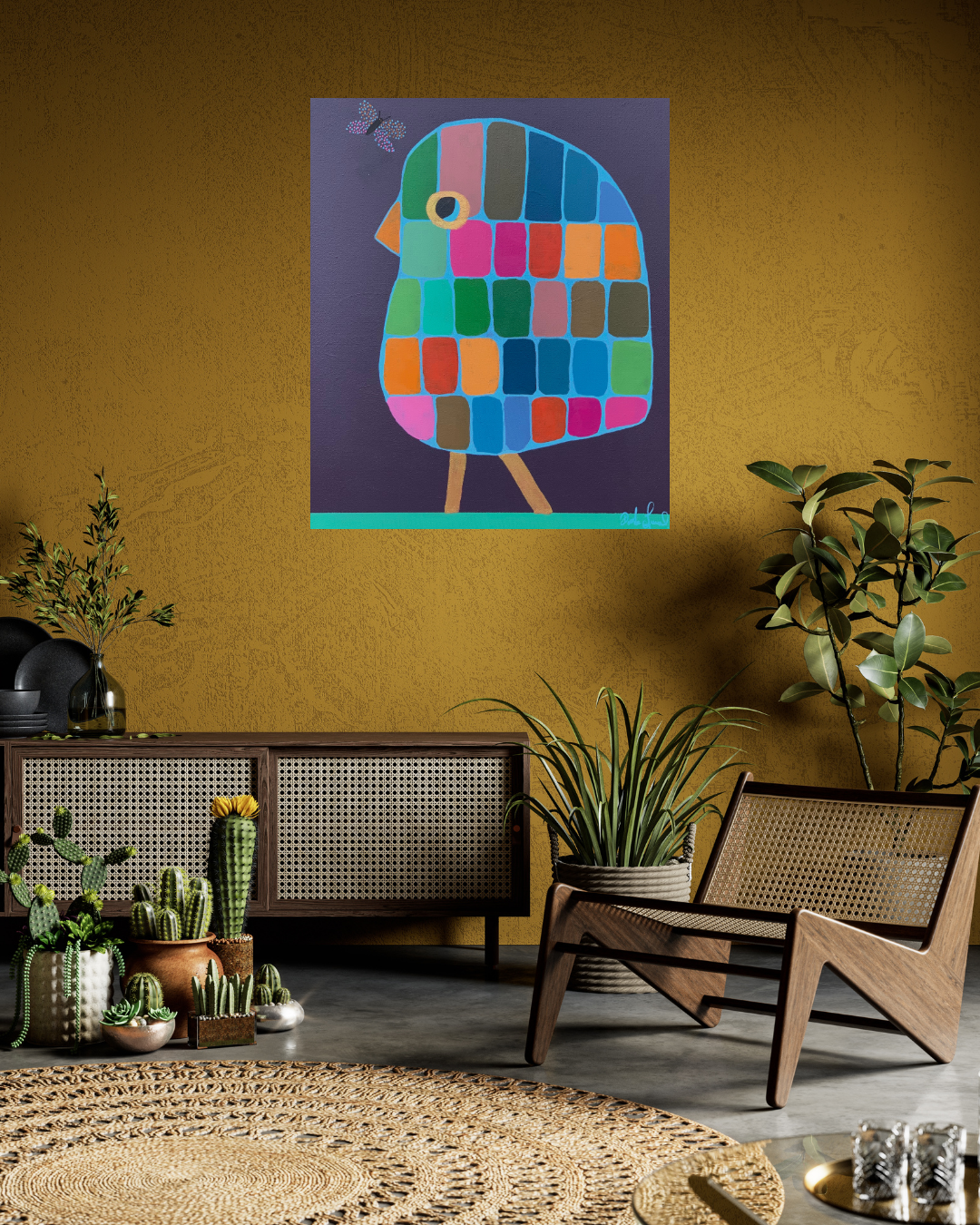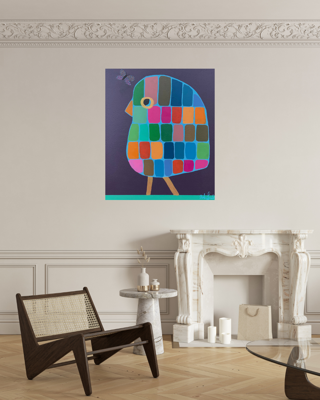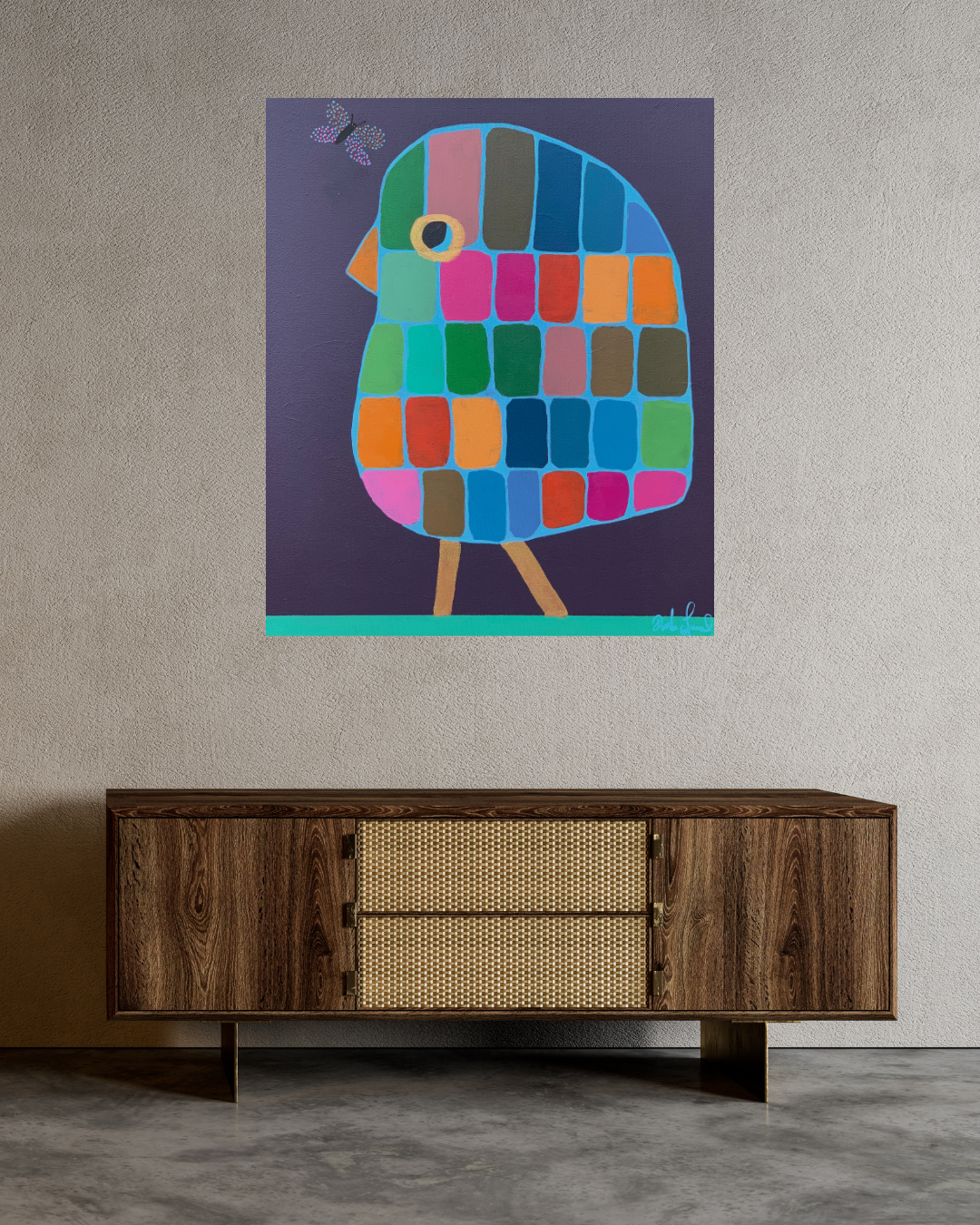 Et legende og farverigt akrylmaleri, der emmer af naivistisk charme og glæde. Den stiliserede fugl, opbygget af farvefelter i klare toner, skaber et grafisk og humoristisk udtryk – perfekt til at bringe personlighed og varme ind i rummet. Maleriet taler til både børn og voksne med sit finurlige motiv og drømmende stemning.