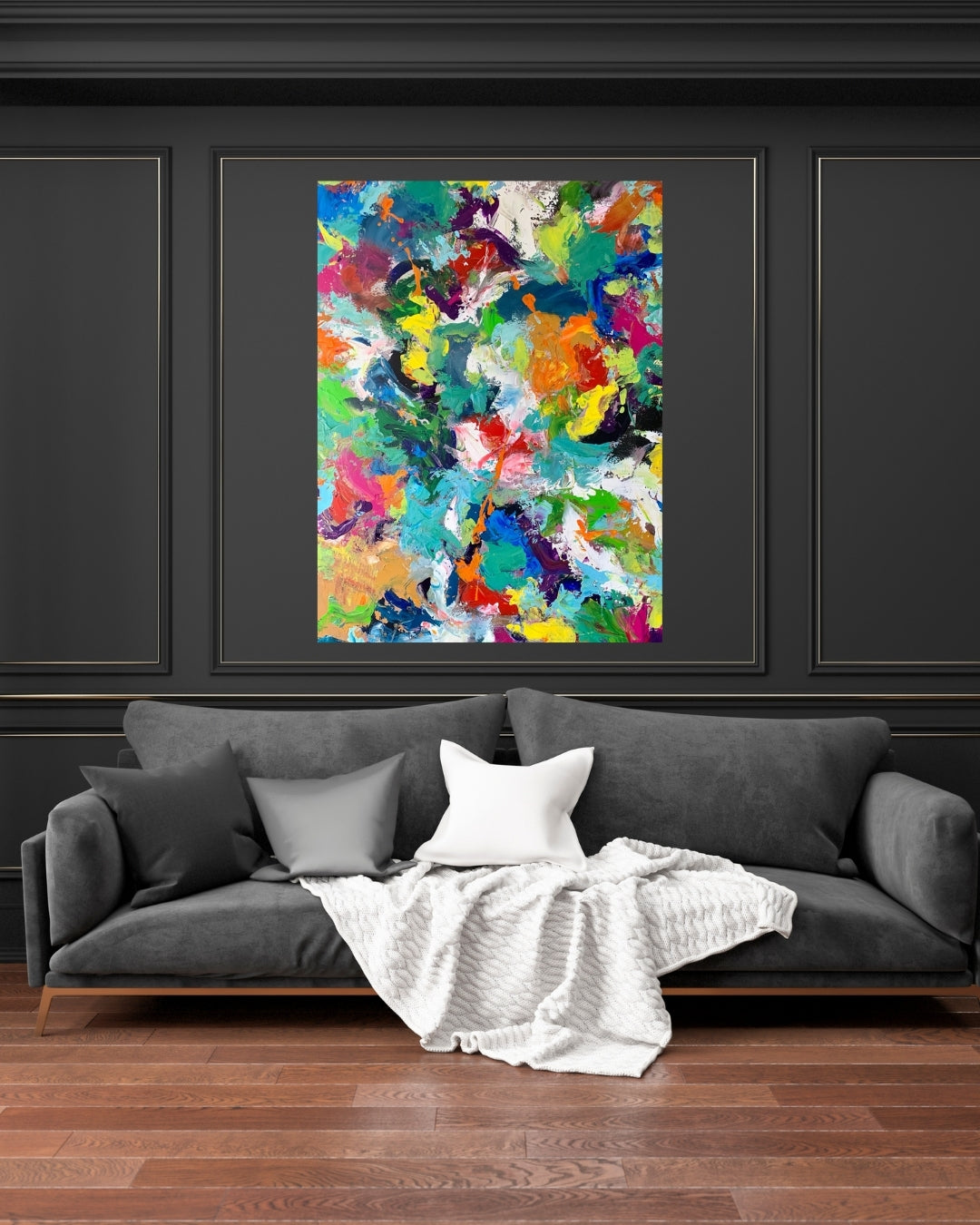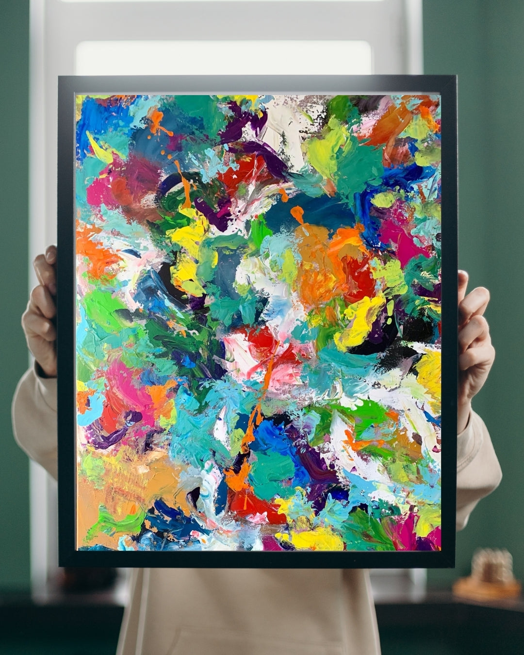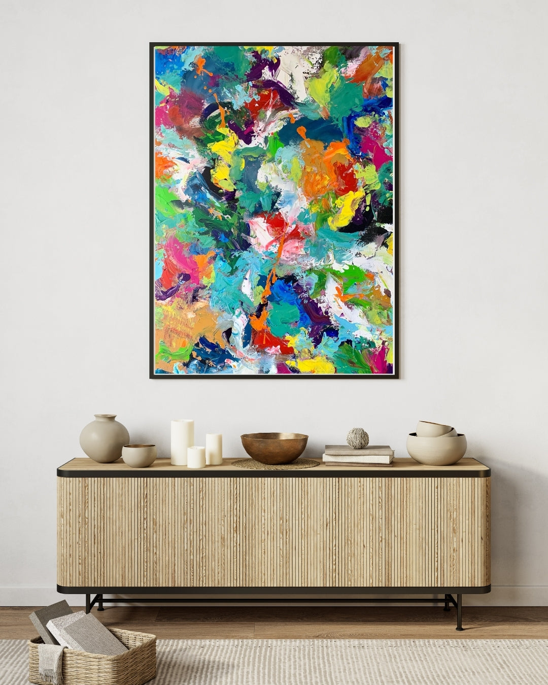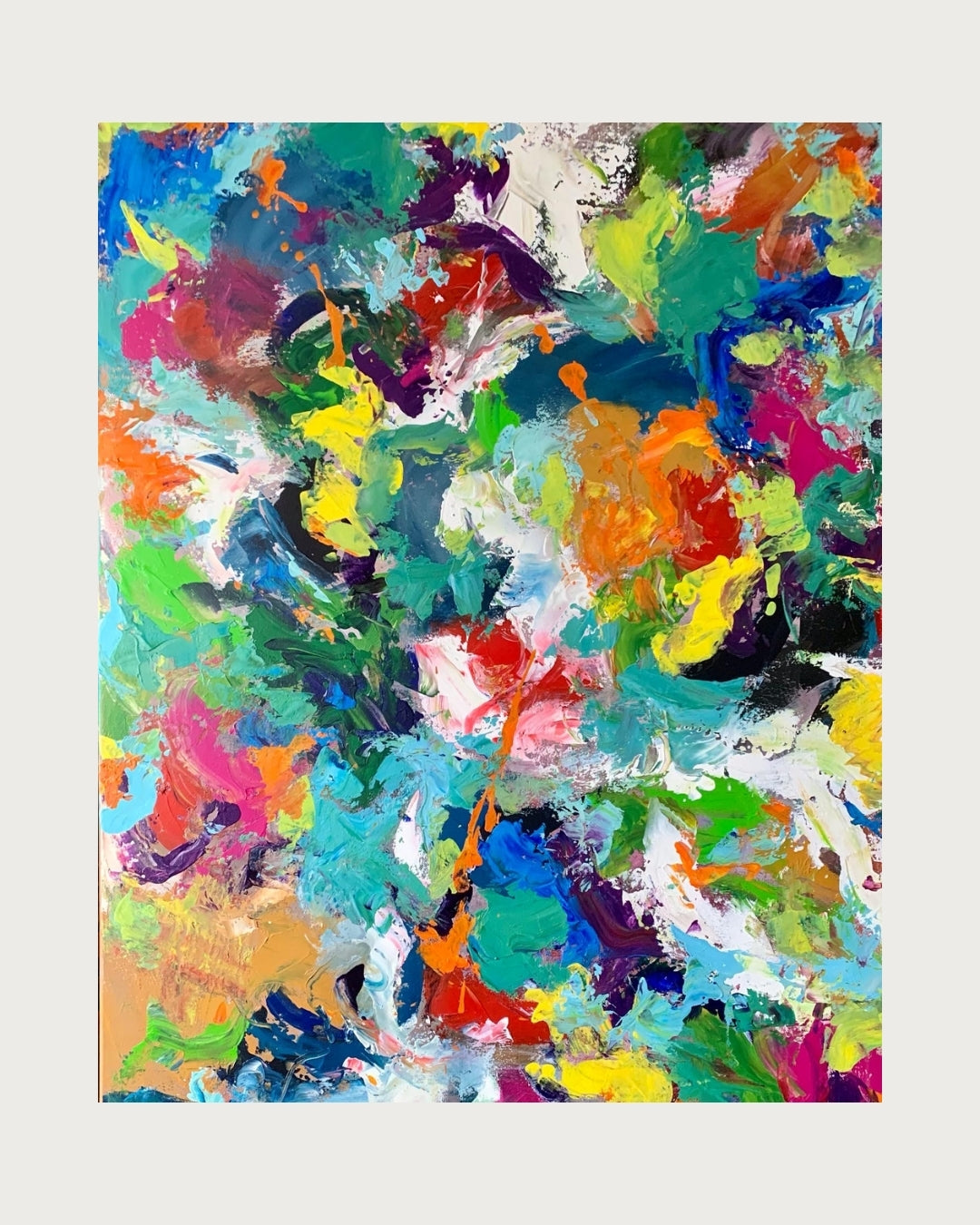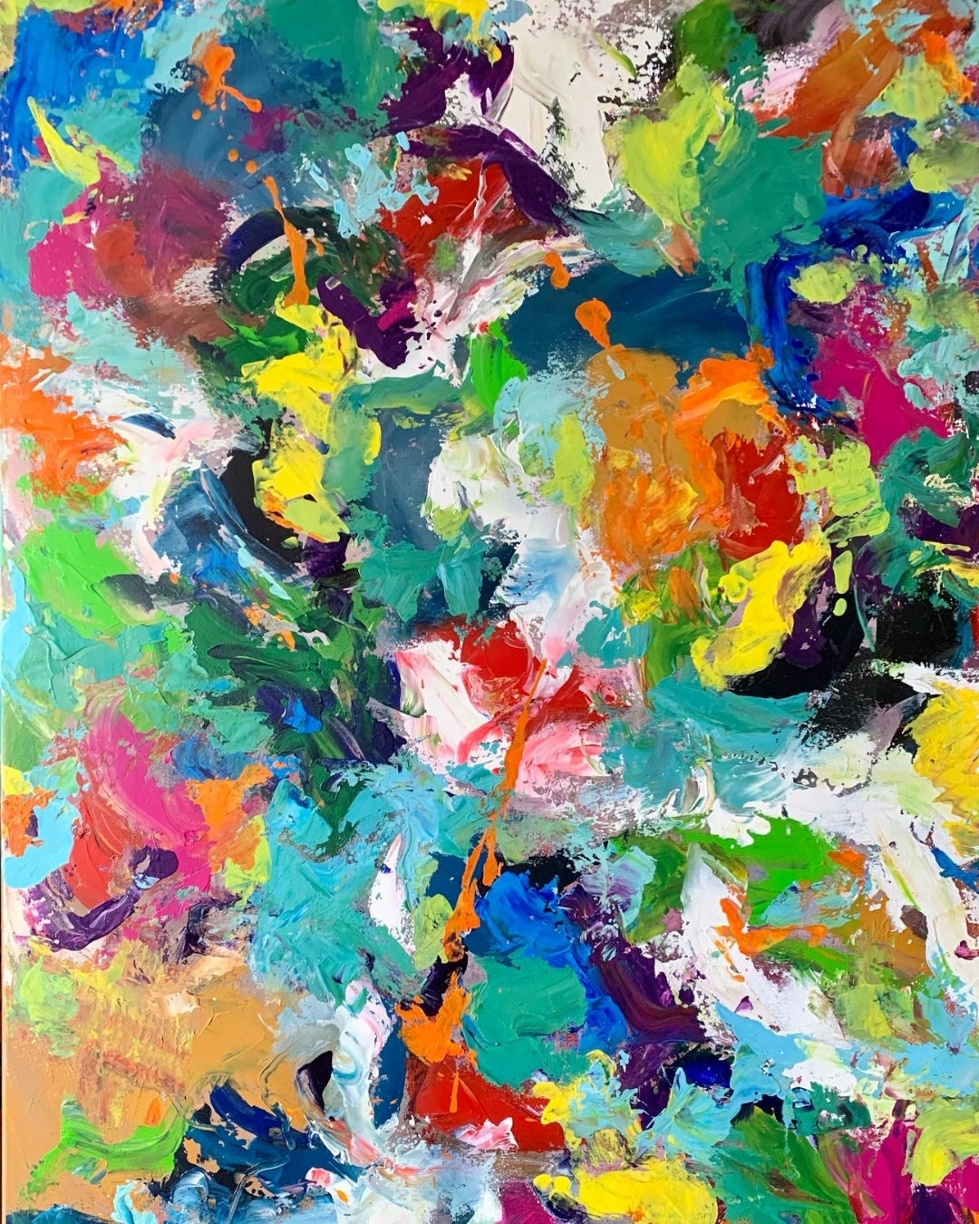 Et intenst og farveeksploderende værk malet i mange lag med akryl. Jeg har ladet farverne føre an – intuitivt og uden regler – og resultatet er et billede, der emmer af energi, glæde og det uperfekte venskab. Det hele er holdt sammen af en sort kant, som giver ro midt i alt det levende.
