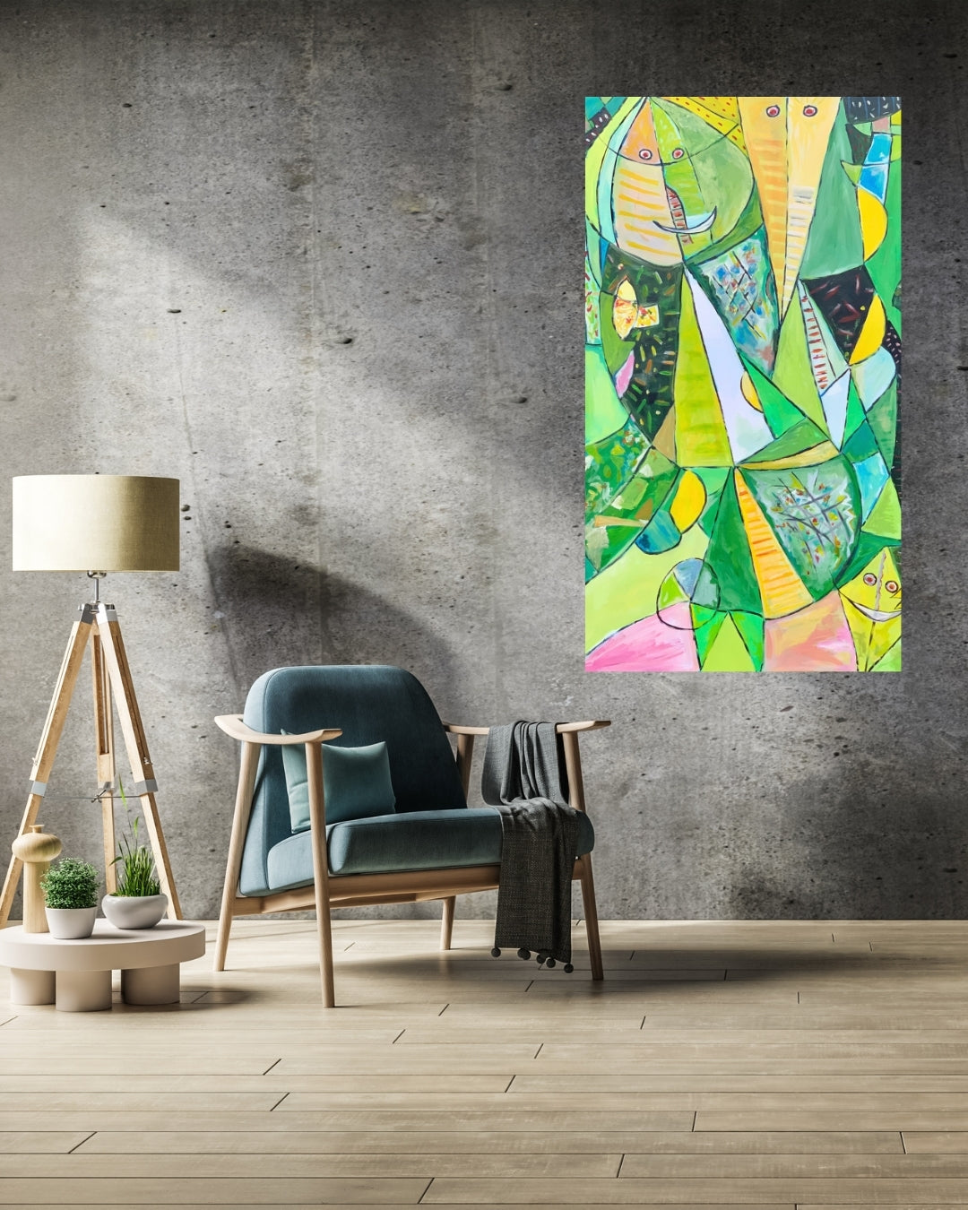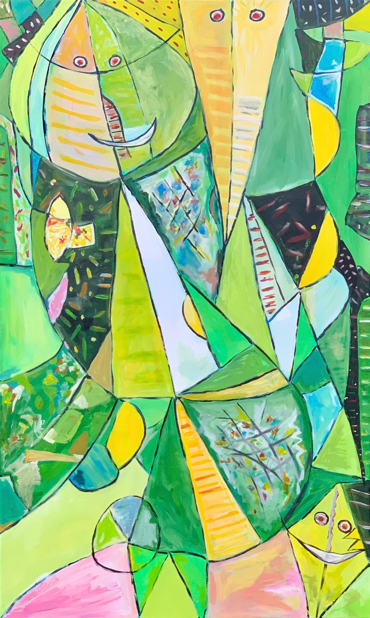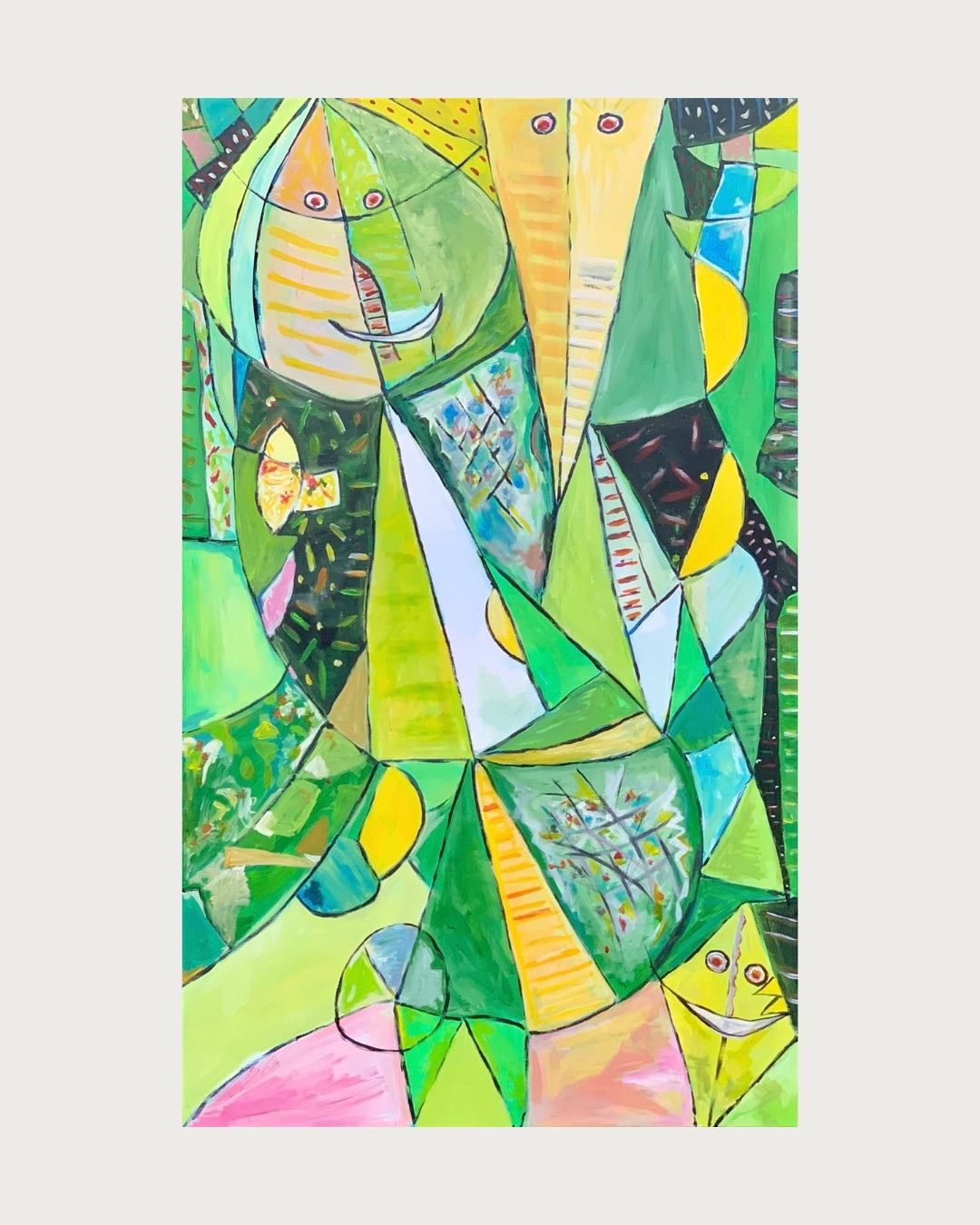 Solgt, Et farverigt og kraftfuldt værk malet med akryl. Inspirationen fra COBRA-stilen ses tydeligt i det vilde udtryk og de stærke farver. Et levende billede, der skaber blikfang og energi i rummet.