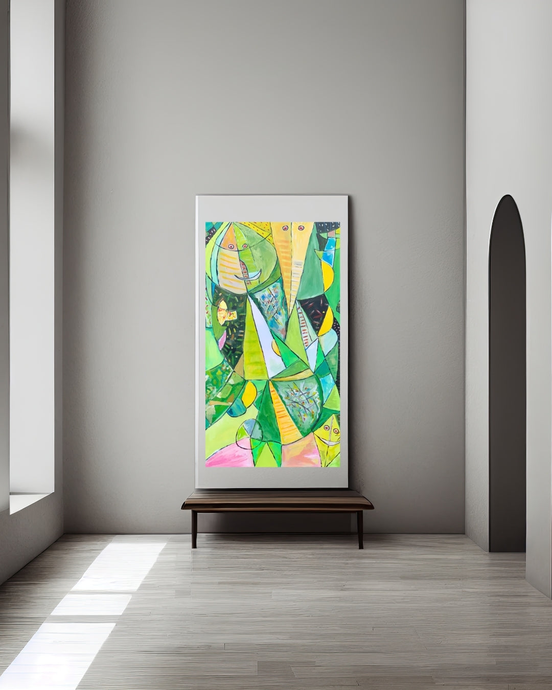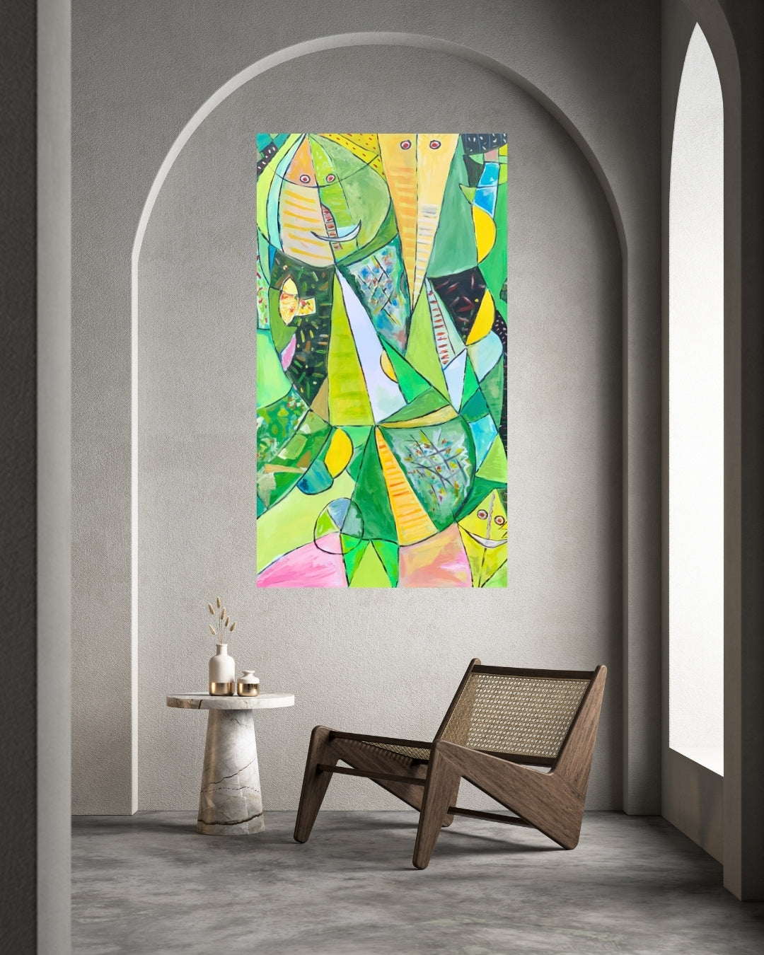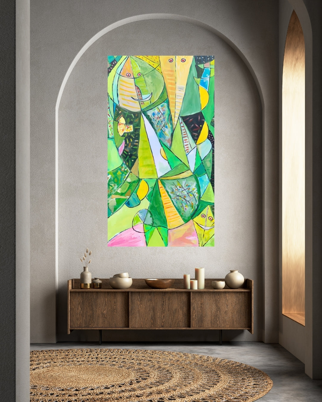 Solgt, Et farverigt og kraftfuldt værk malet med akryl. Inspirationen fra COBRA-stilen ses tydeligt i det vilde udtryk og de stærke farver. Et levende billede, der skaber blikfang og energi i rummet.