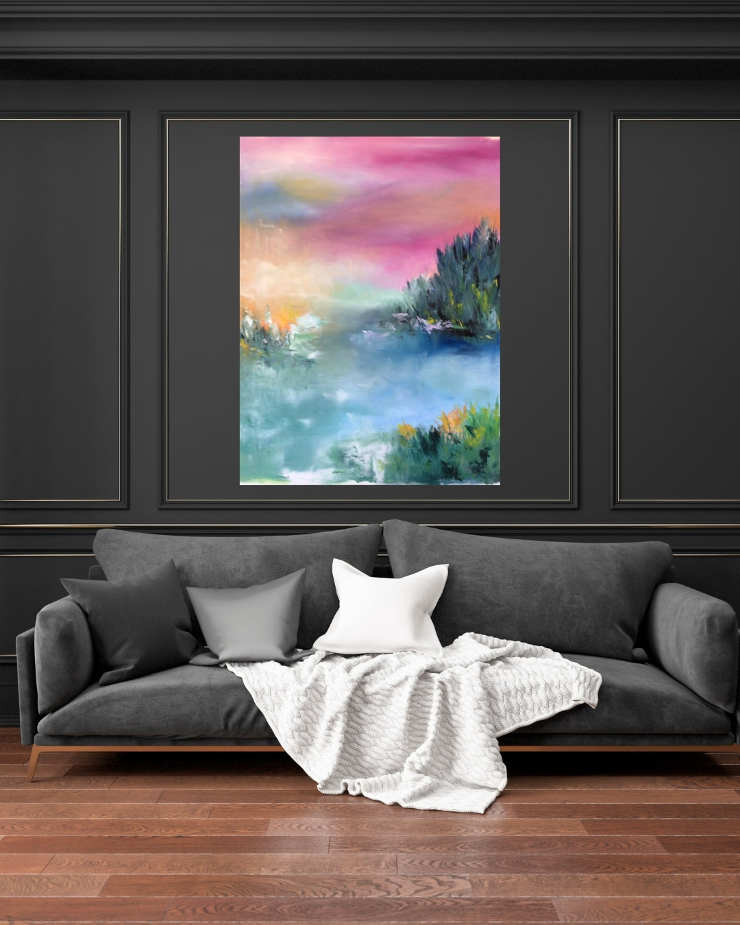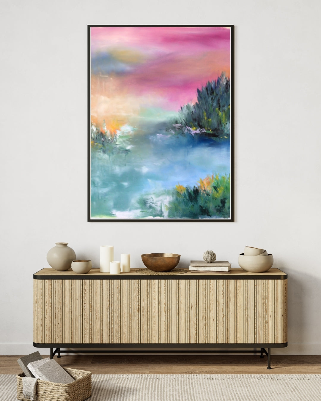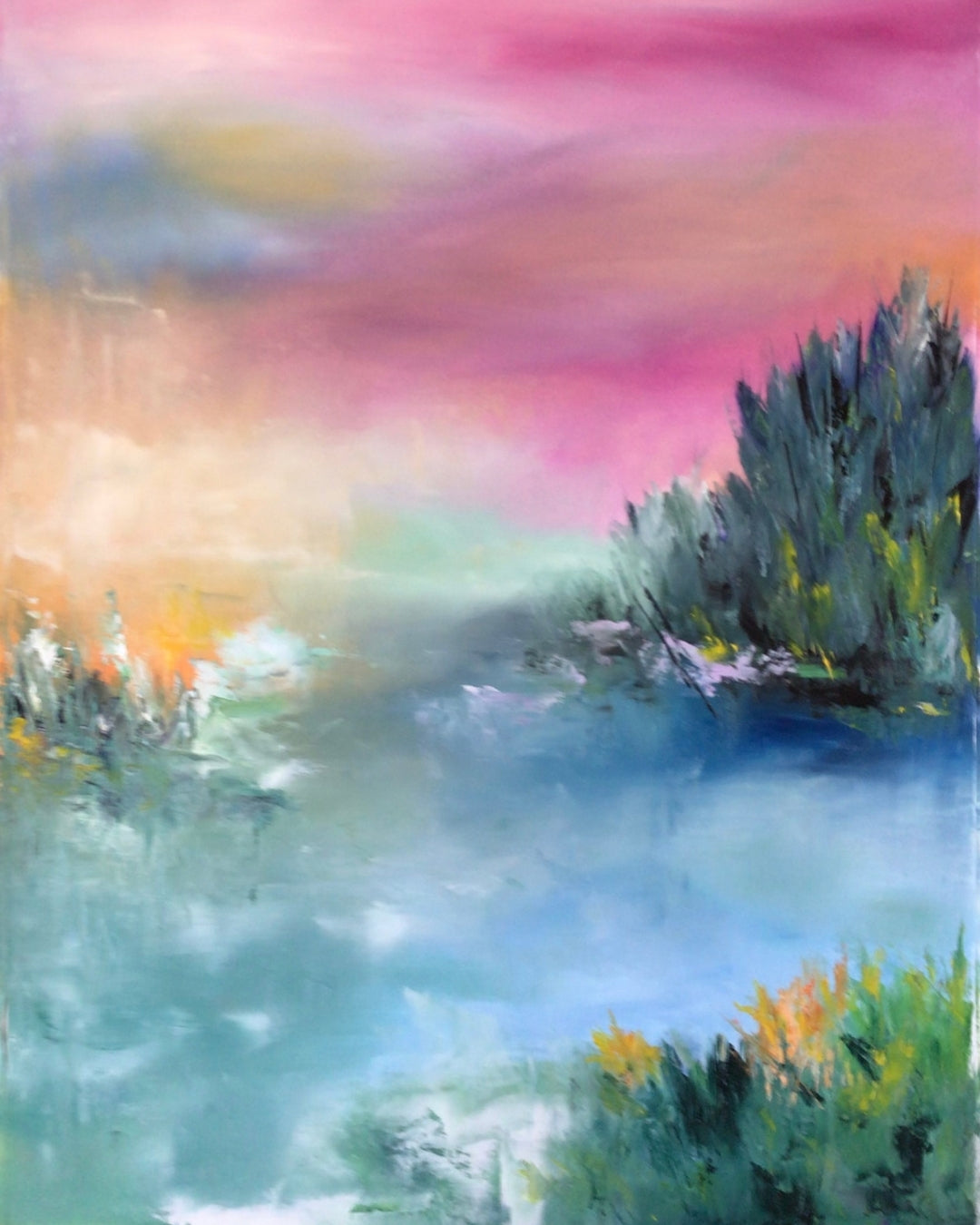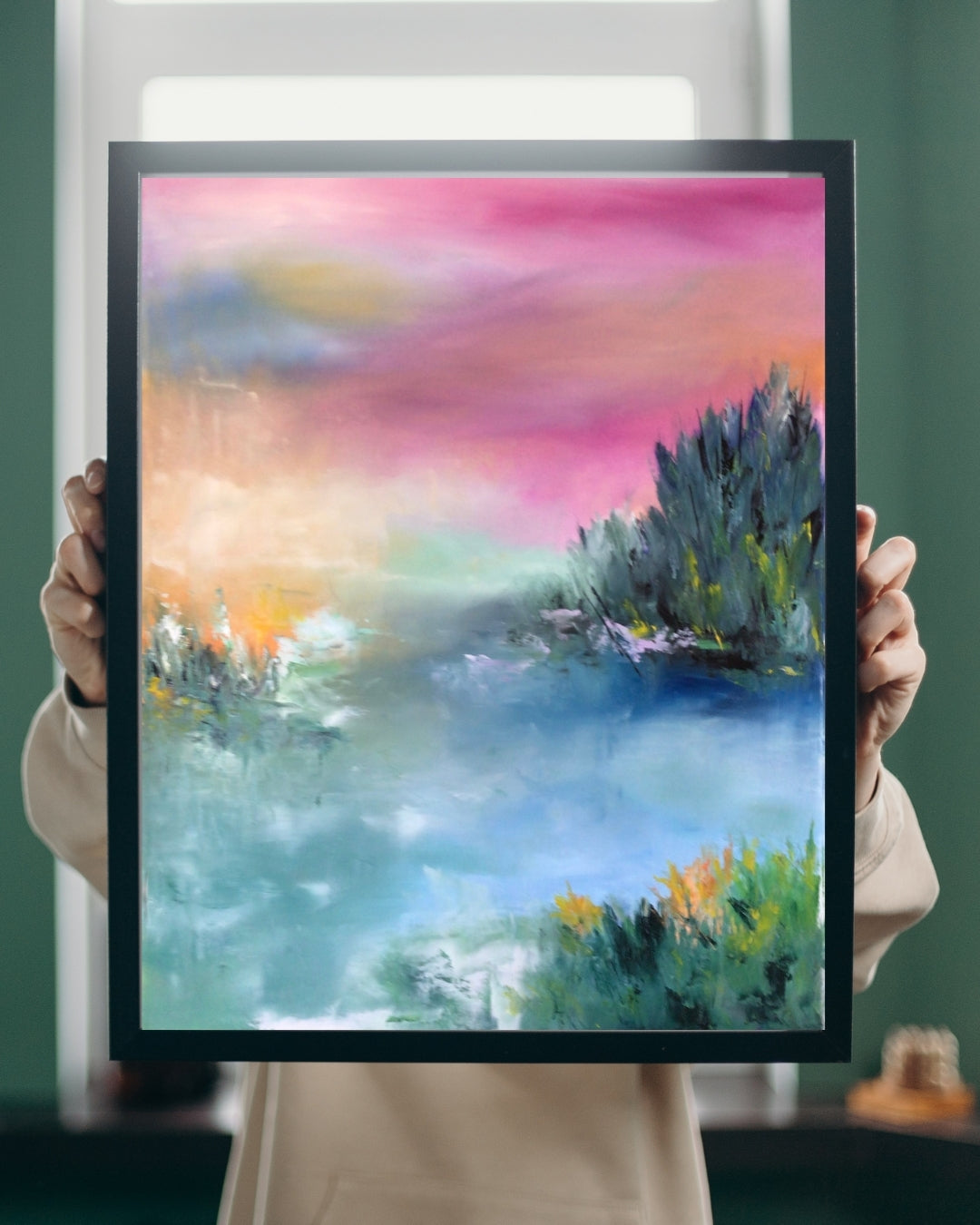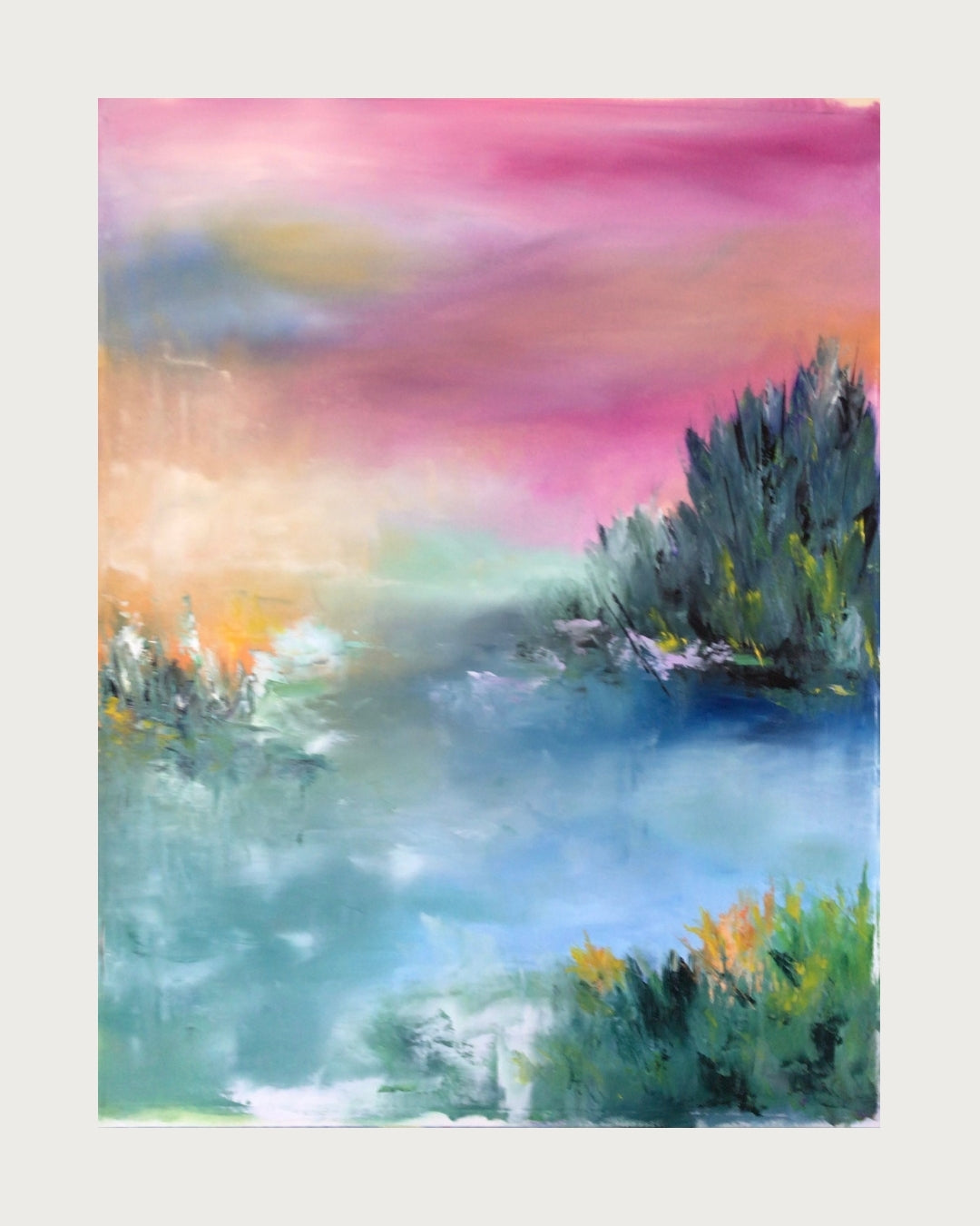 Et roligt og stemningsfuldt værk malet med olie på papir – inspireret af naturens egne farver og former. Farverne flyder blødt sammen i et drømmende landskab, hvor både lys og luft får plads.