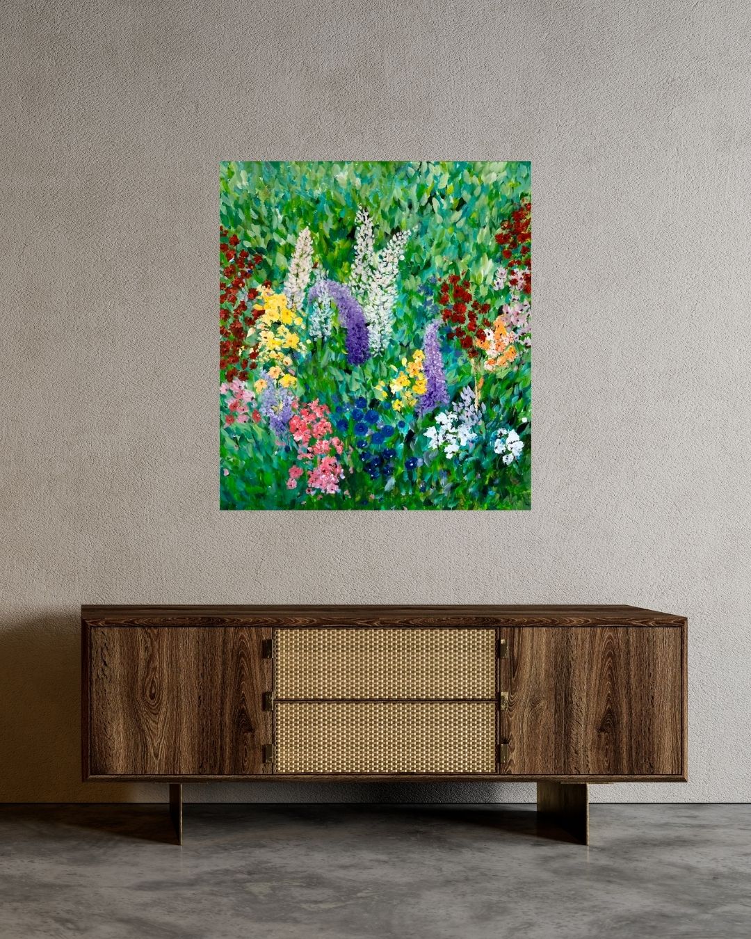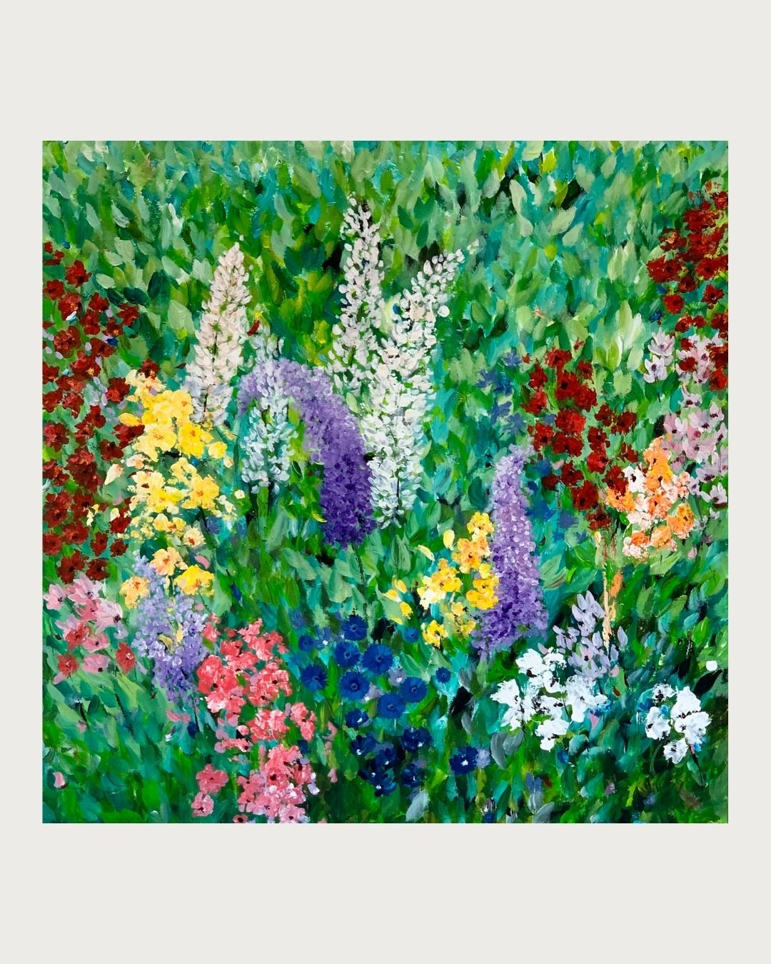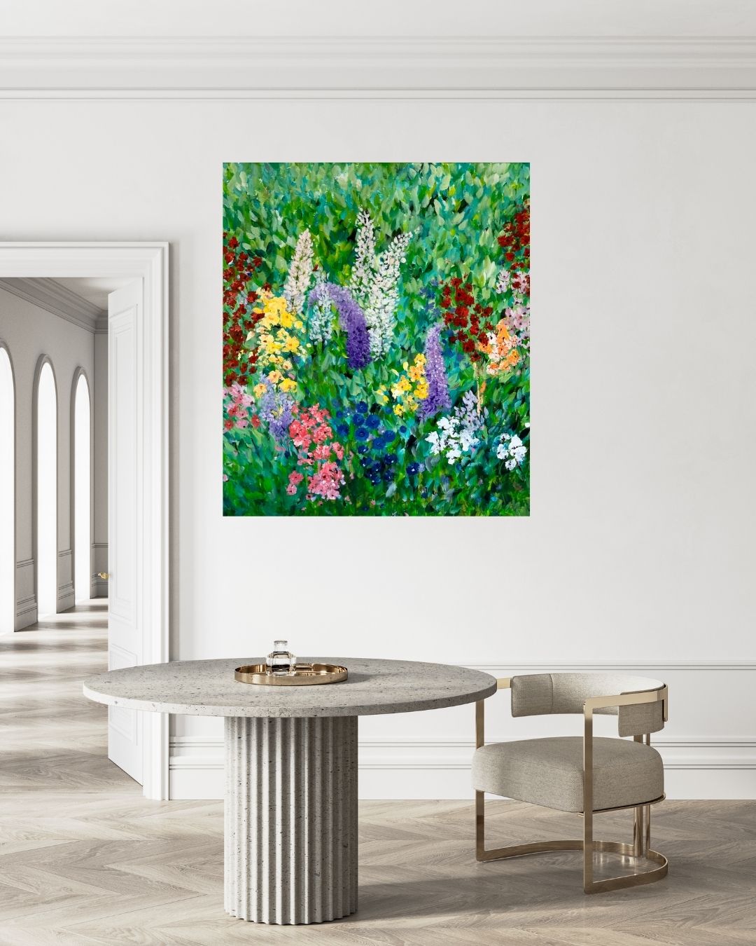 Farverigt og livsbekræftende naturmaleri inspireret af sommerens frodighed og blomstrende haver. Malet i akryl og mixmedia på kvalitetslærred fra Boga design. Et sanseligt værk fyldt med energi og optimisme.