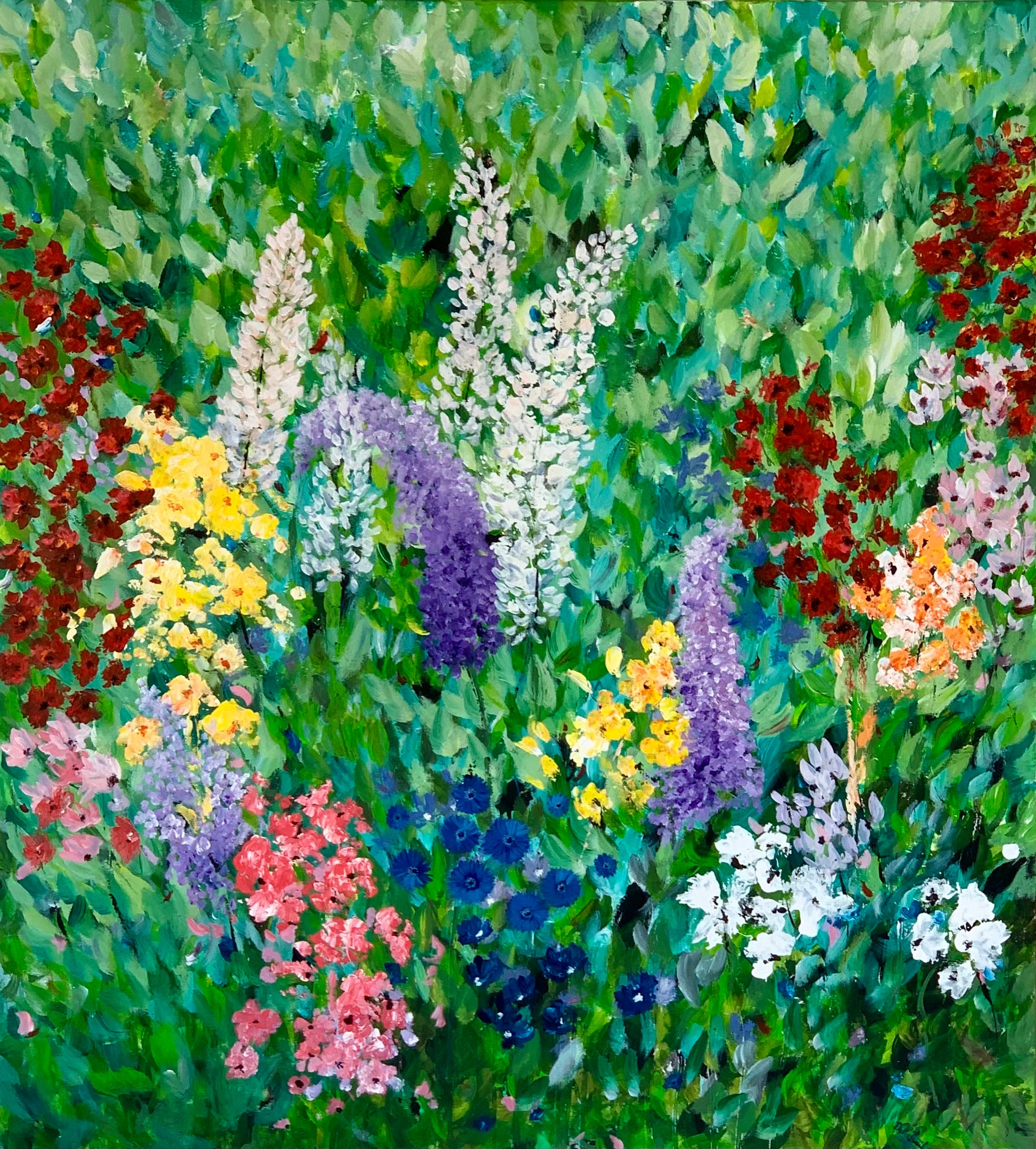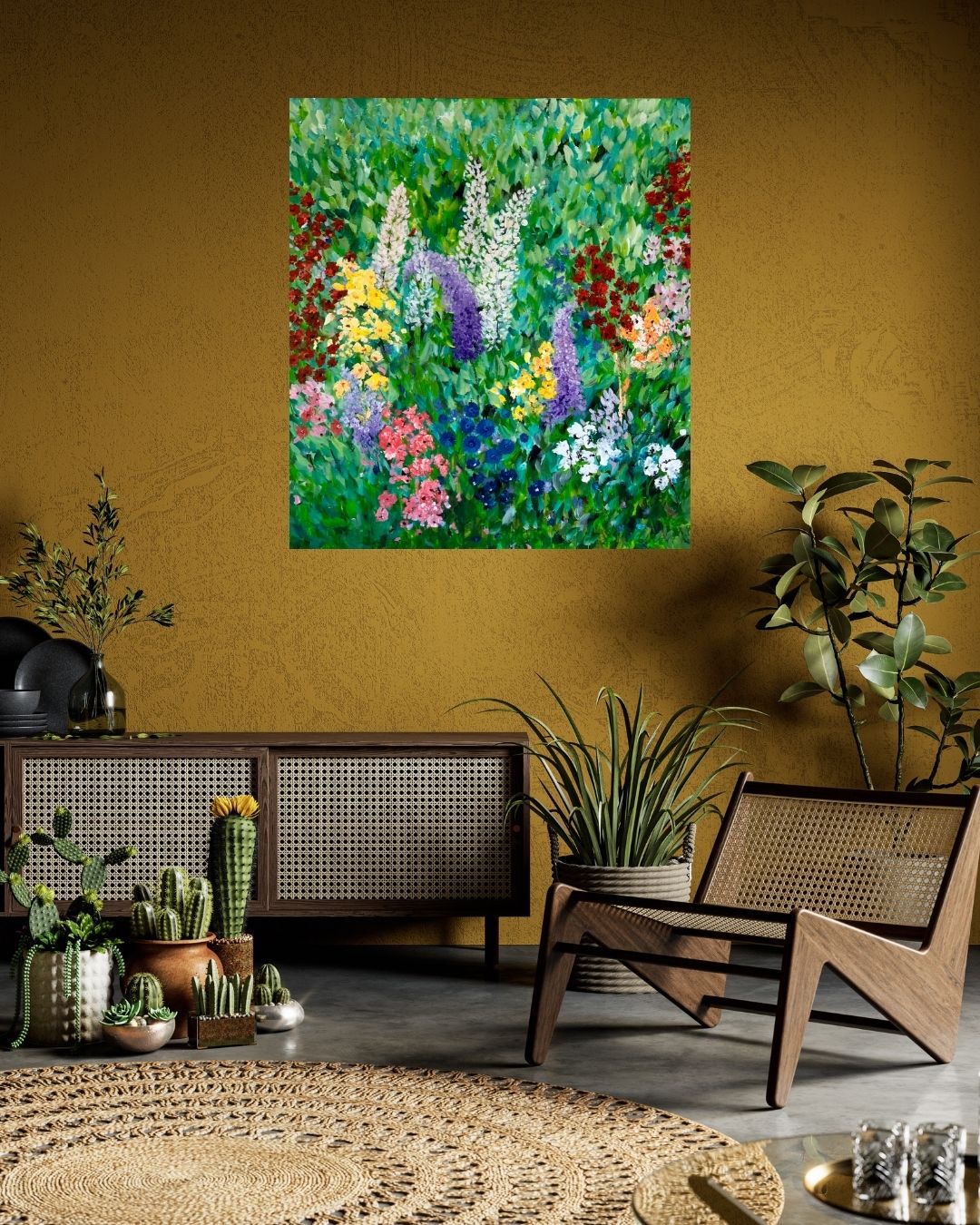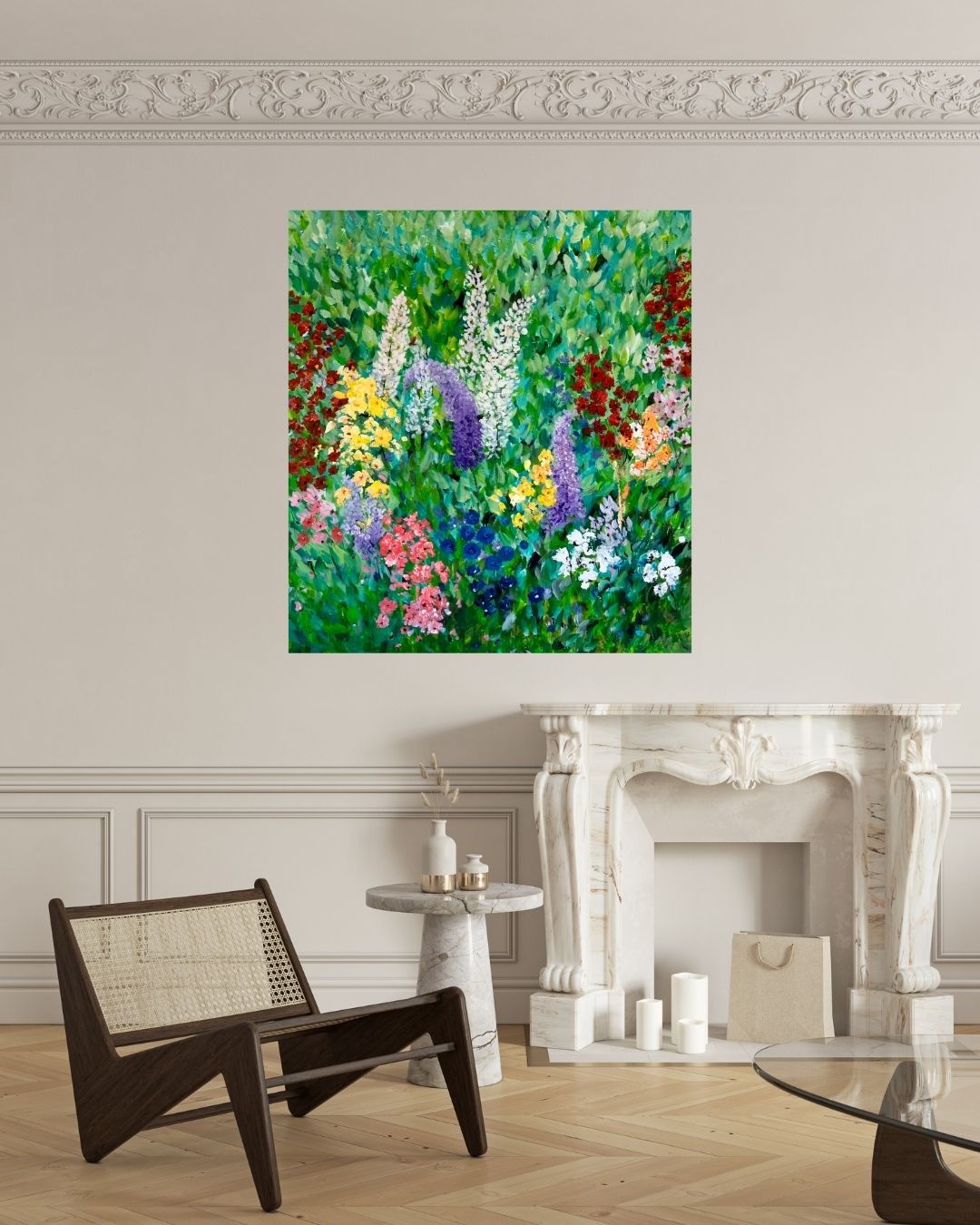 Farverigt og livsbekræftende naturmaleri inspireret af sommerens frodighed og blomstrende haver. Malet i akryl og mixmedia på kvalitetslærred fra Boga design. Et sanseligt værk fyldt med energi og optimisme.