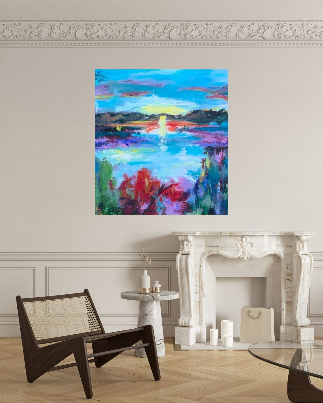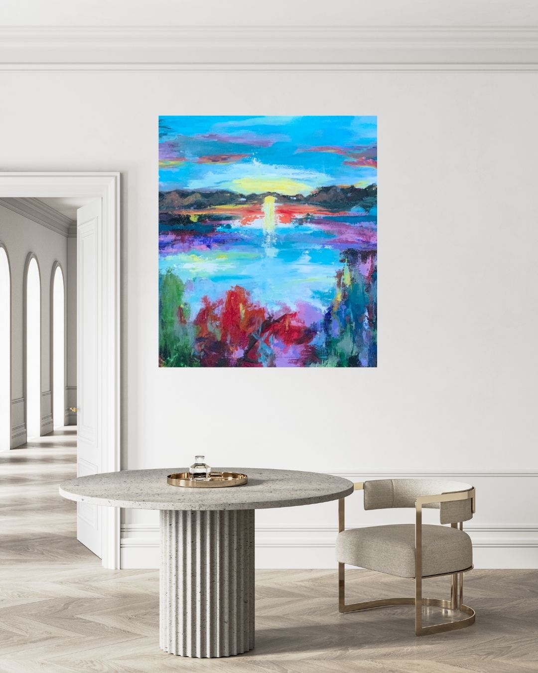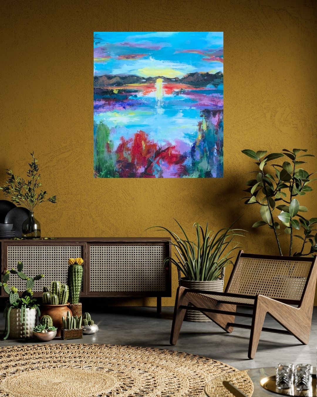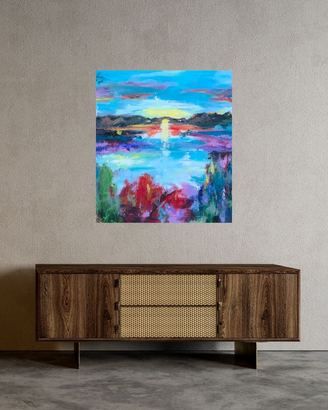 Farverigt akrylmaleri inspireret af naturens skønhed og magiske solopgange. Malet i flere lag med en blanding af akryl og mixed media, hvilket skaber dybde og bevægelse i landskabet. Farverne er livlige og opløftende – et værk skabt til glæde og lys i hjemmet.
