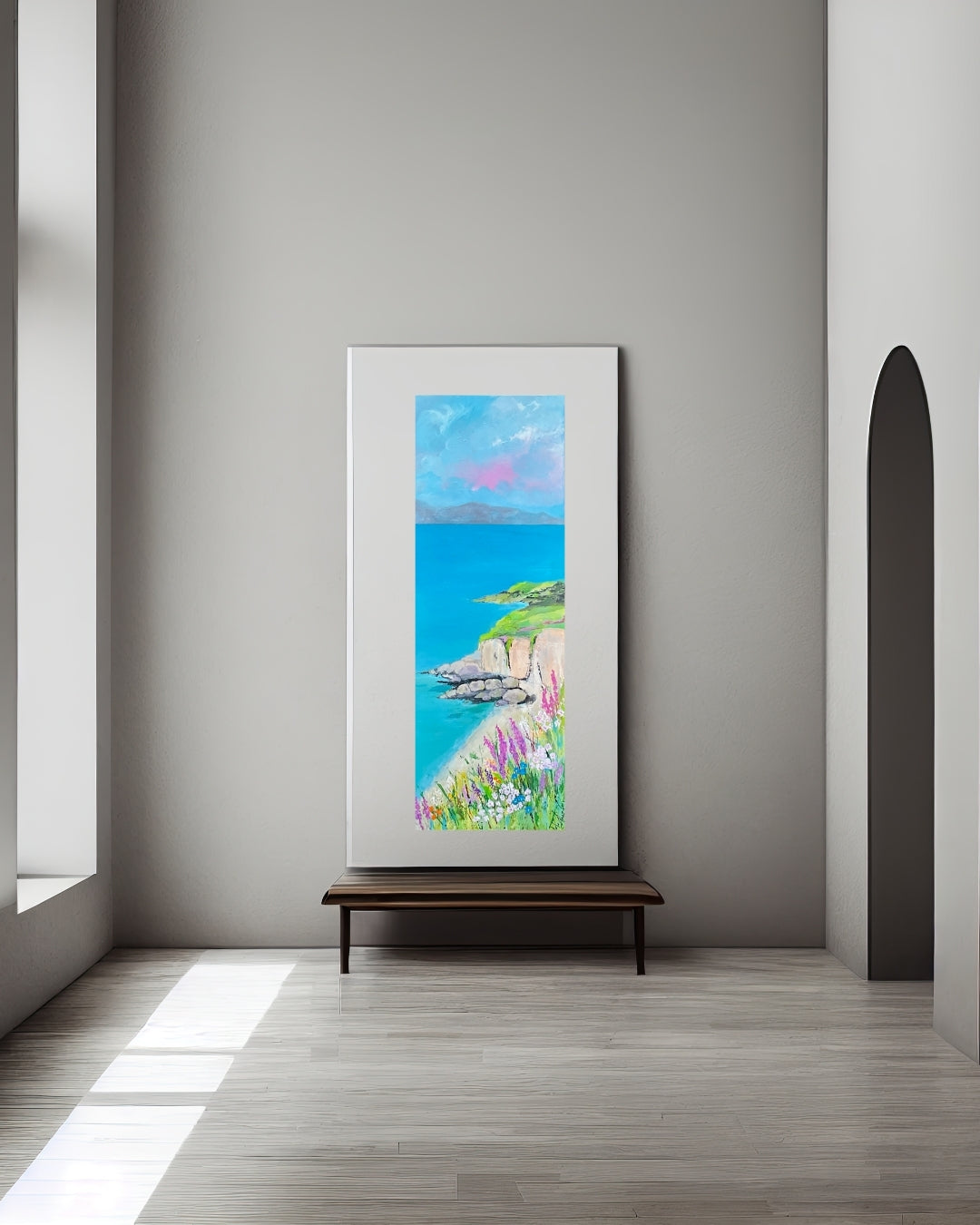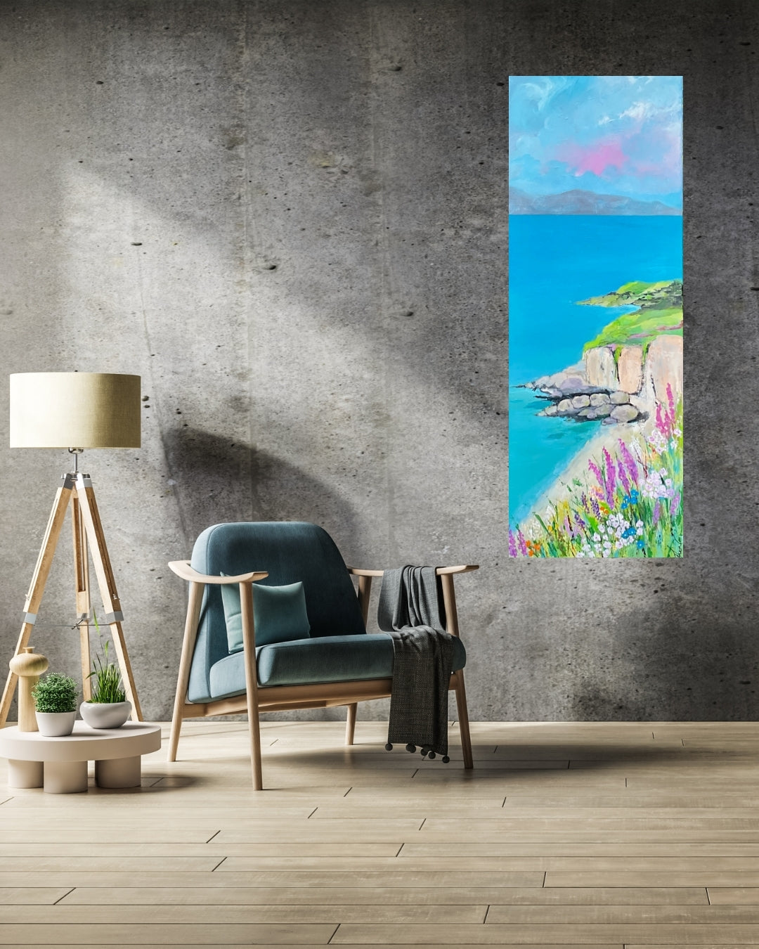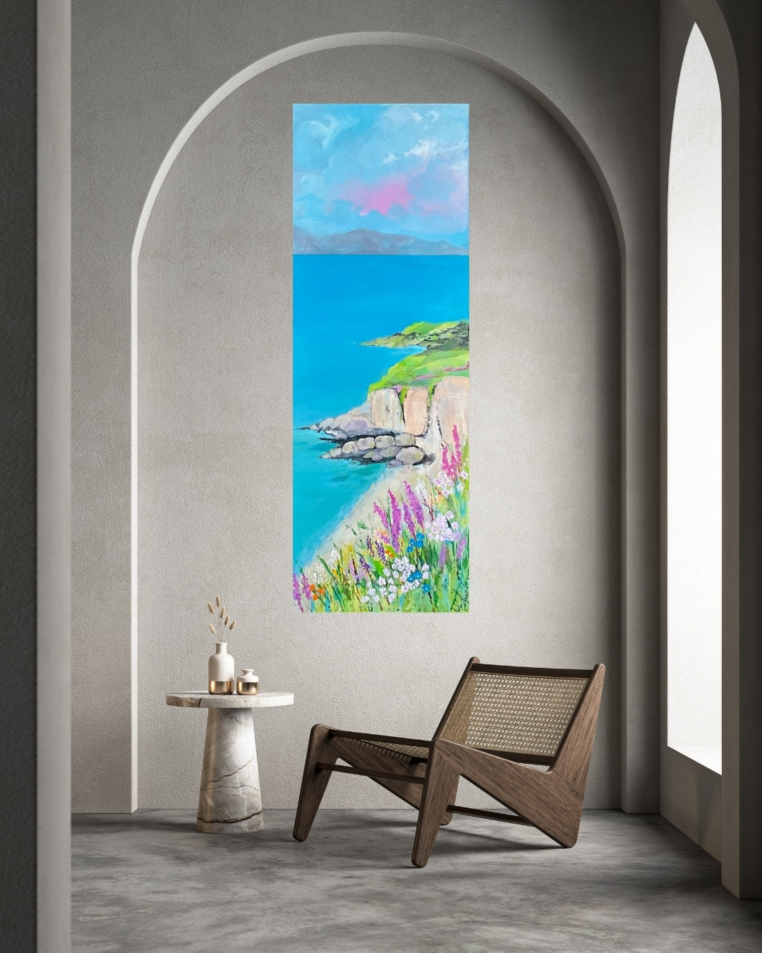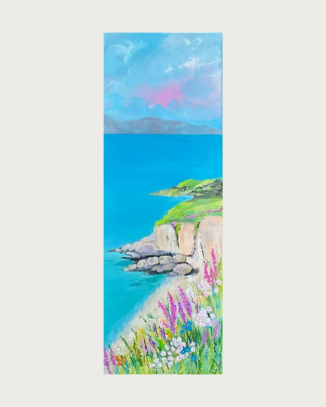 Et livsbekræftende og roligt naturmaleri, der inviterer dig til at drømme dig væk til klipper, kyst og vilde blomster. Værket er malet i friske, klare farver og emmer af frihed og nærvær. Den dybe blå himmel og havets spejlende overflade skaber balance og ro.