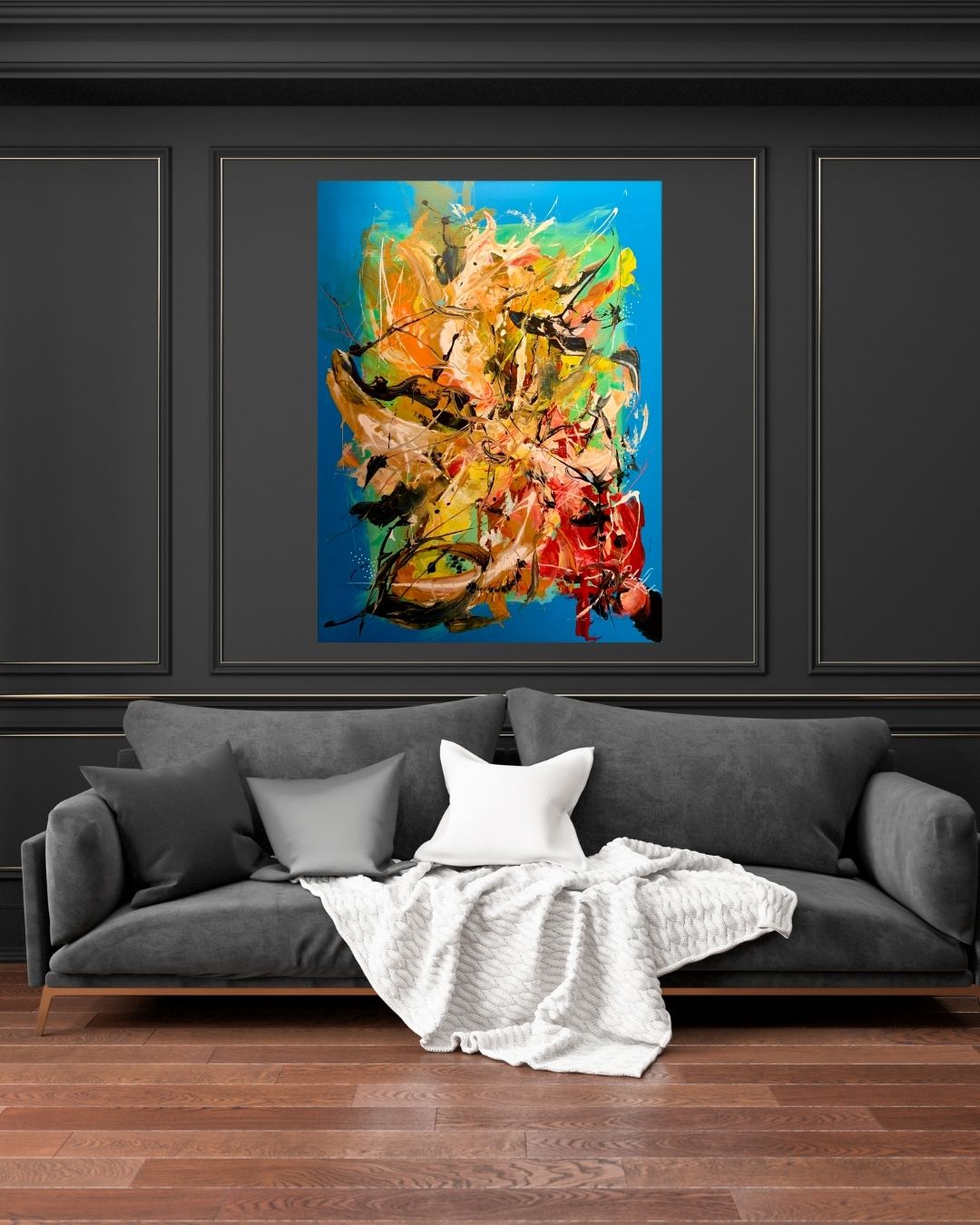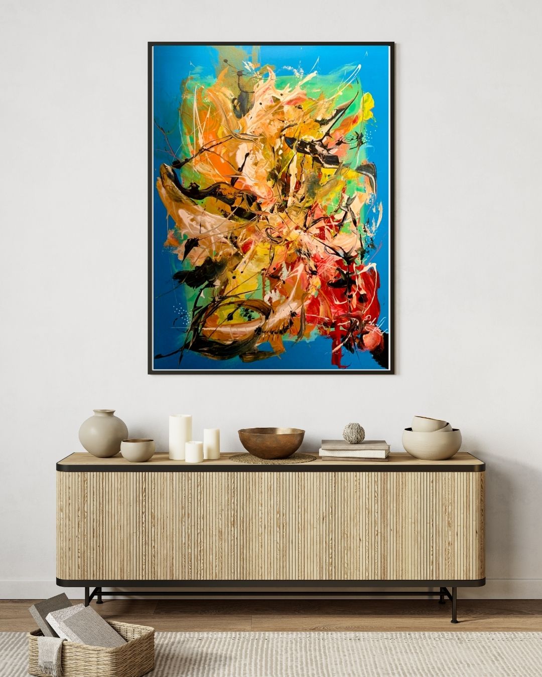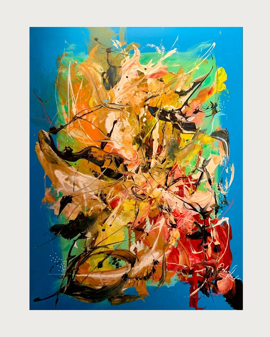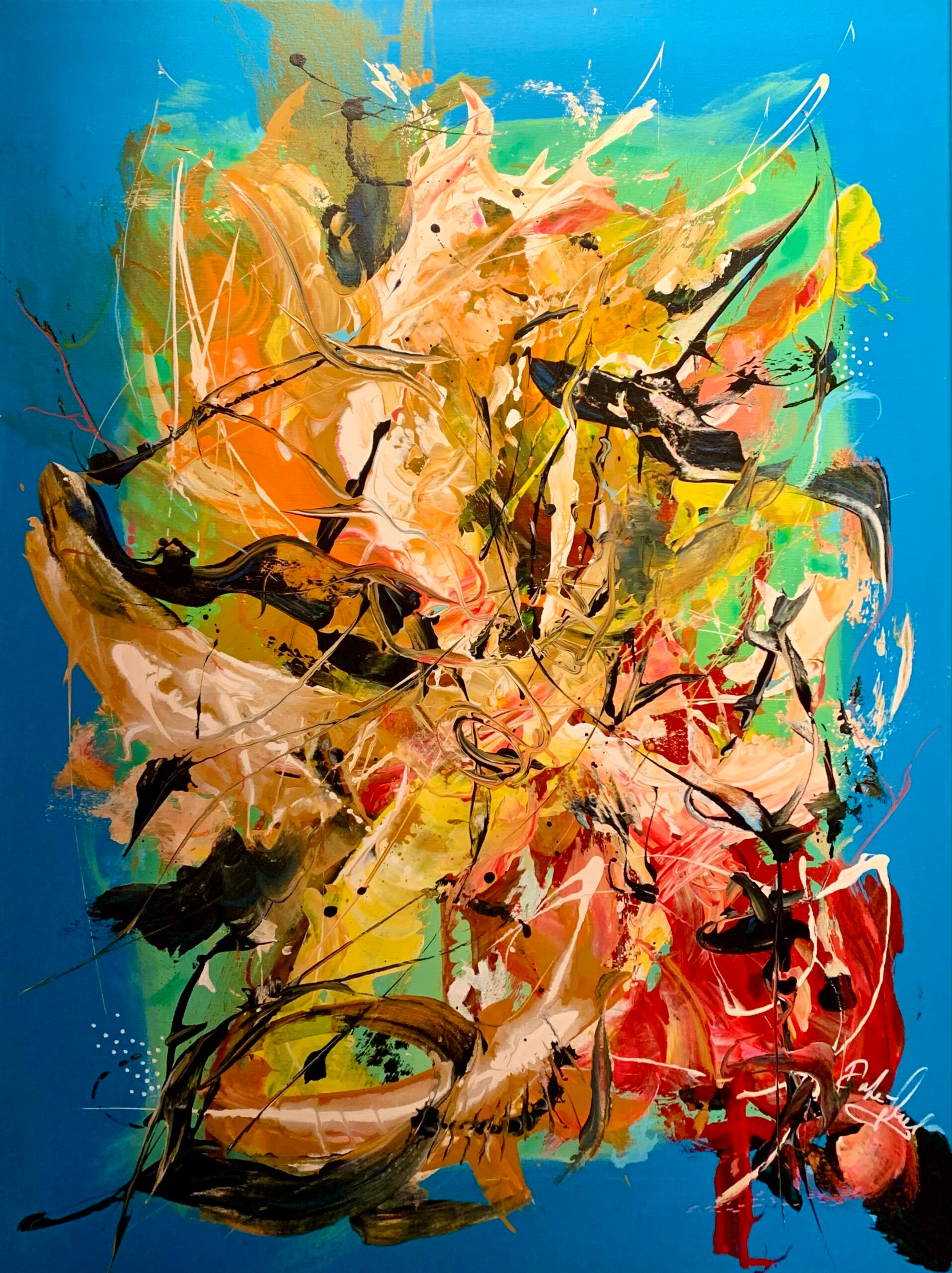 Intuitivt og fantasifuldt maleri, hvor farver og former får frit spil. Lag på lag af akryl, olieblyant og posca-tusch skaber en eksplosion af bevægelse og detaljer. Et unikt værk, der inviterer til fordybelse og fri fortolkning.