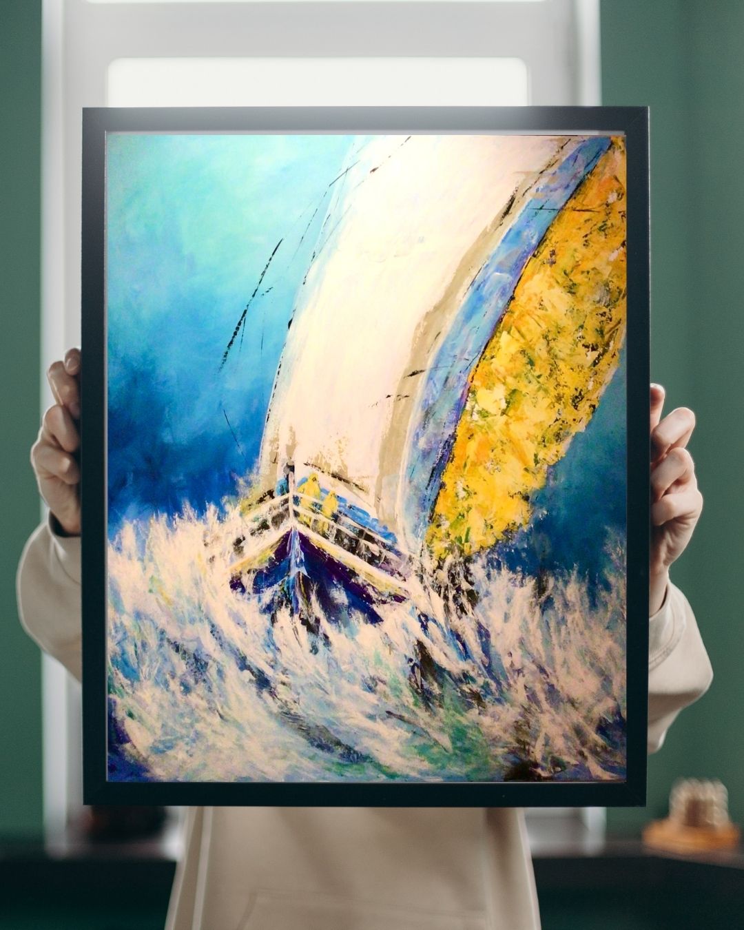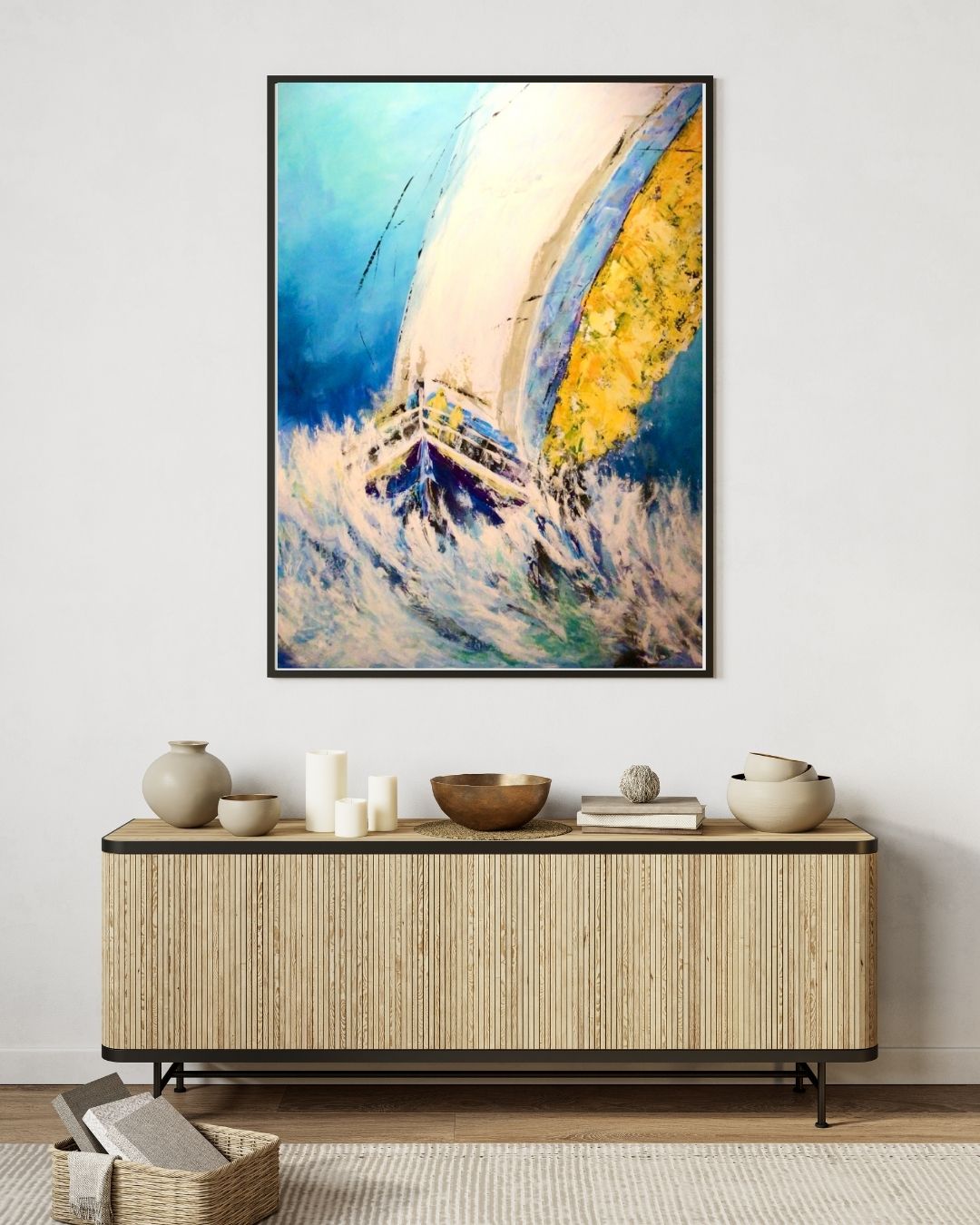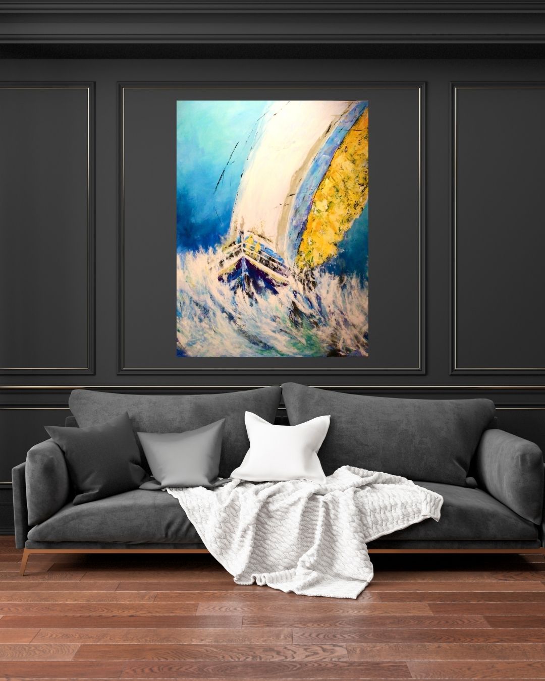 Dynamisk maritimt maleri, skabt ud fra kunstnerens egen fantasi og tanker om de mange sejlere, der kæmper mod elementerne på åbent hav. Malet i flere lag med akrylmaling, hvilket giver en dramatisk dybde og bevægelse i både bølger og sejl.